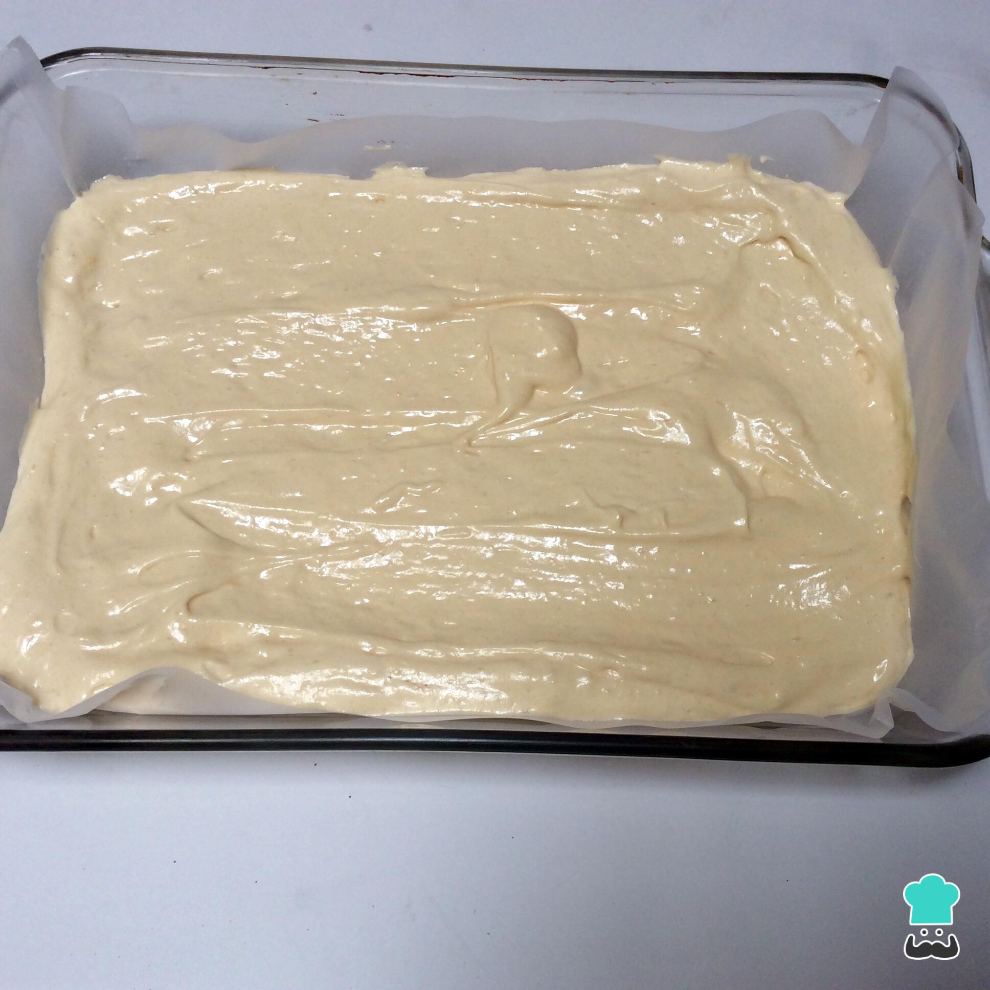 Coloque a mistura deste bolo pão de ló em uma assadeira forrada com papel manteiga e leve a assar no forno preaquecido a 165ºC por 20 minutos, ou até que fique ligeiramente dourado na laterais.