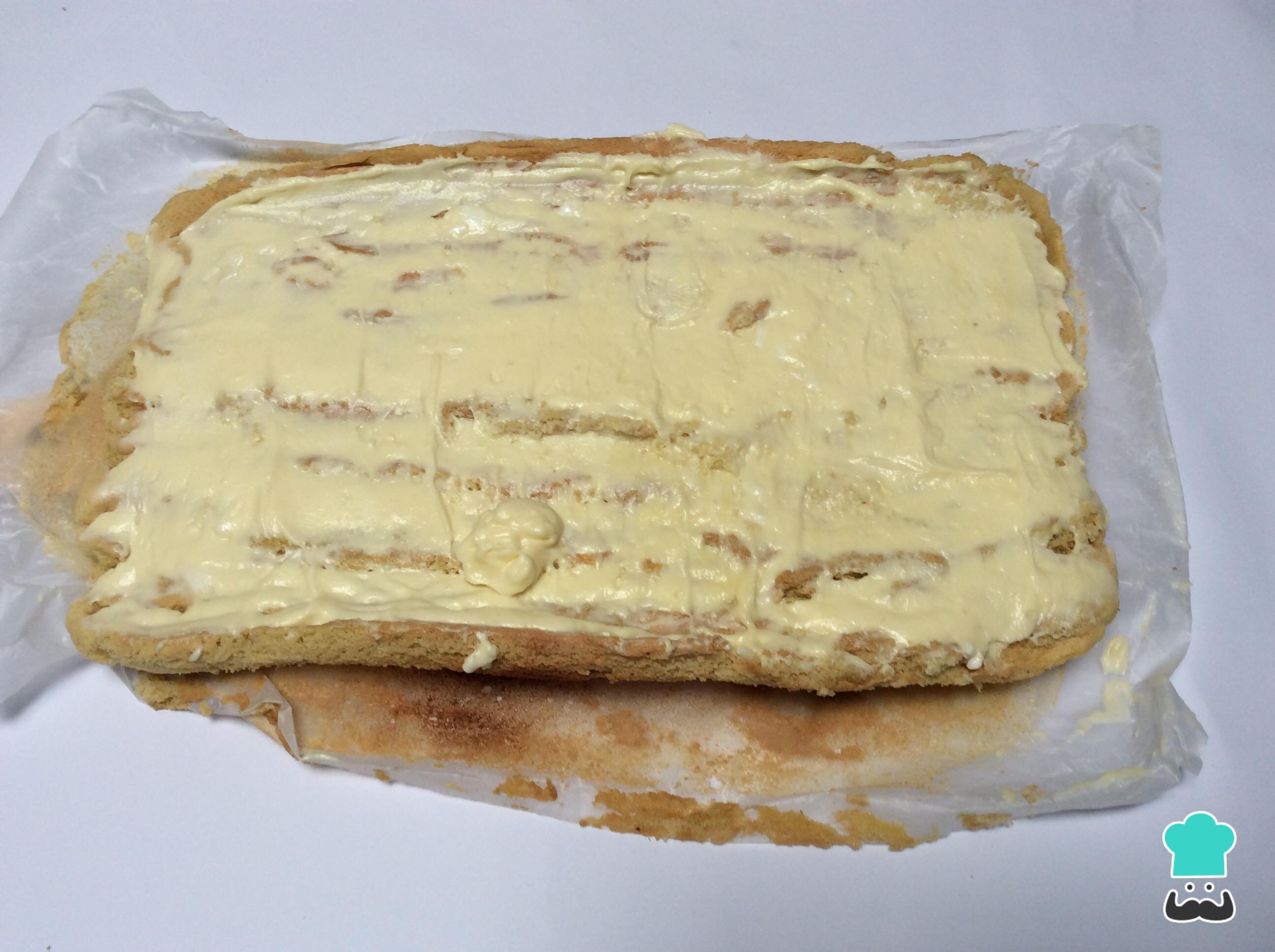Assim que o bolo estiver assado, retire do forno e deixe esfriar. Depois desgrude do papel, vire ao contrário e espalhe o creme sobre todo ele.