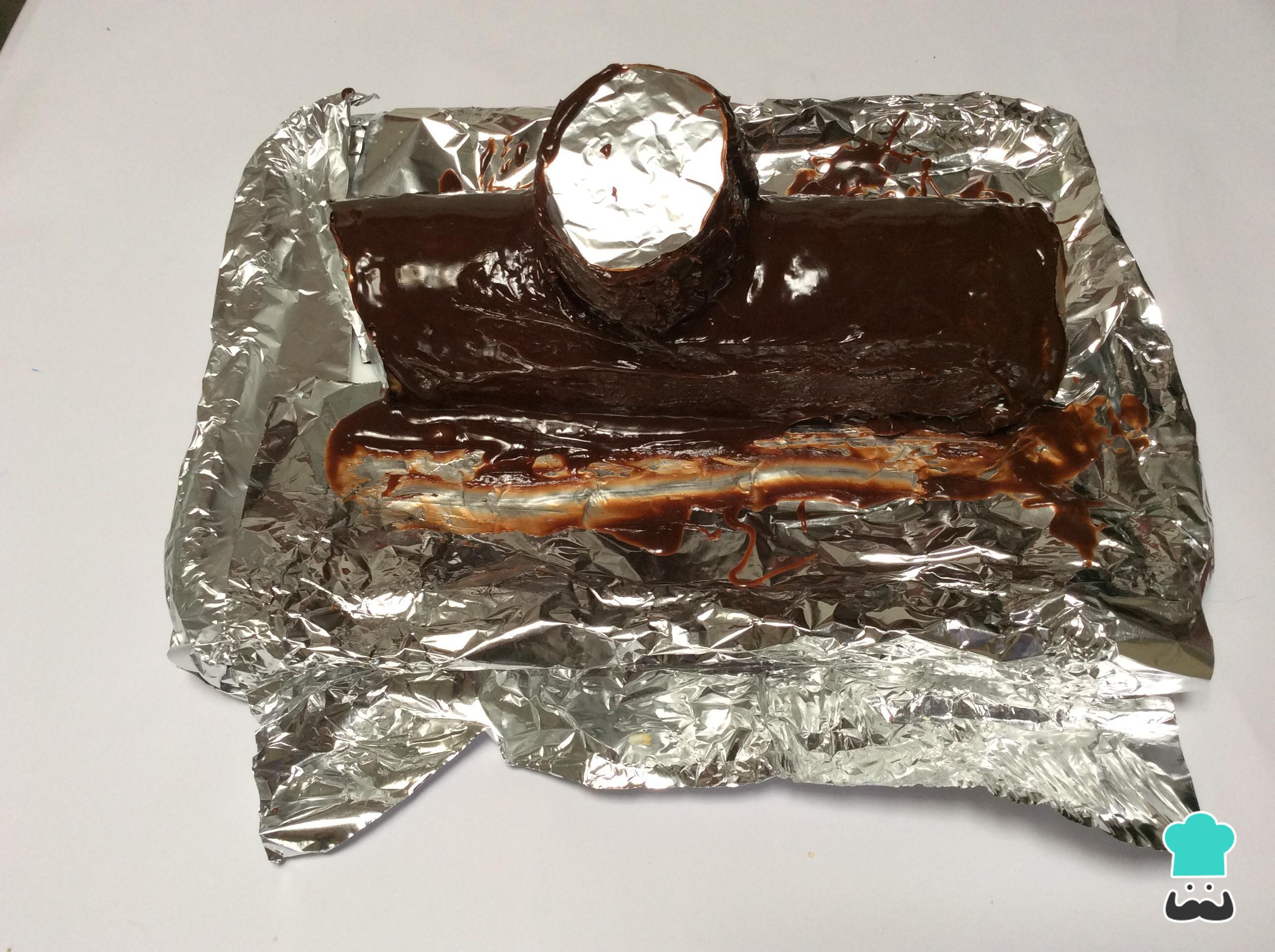 Esquente o creme de leite, adicione o restante chocolate picado e misture muito bem. Cubra todo o bolo com essa mistura de ganache e reserve na geladeira para endurecer. Depois, com um garfo, raspe ligeiramente o chocolate e assim conseguirá uma textura semelhante aos troncos das árvores.