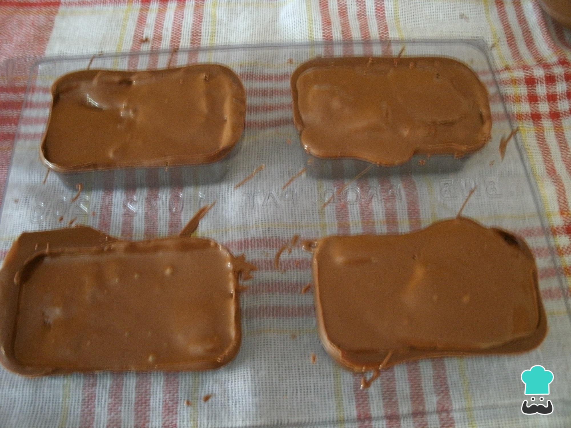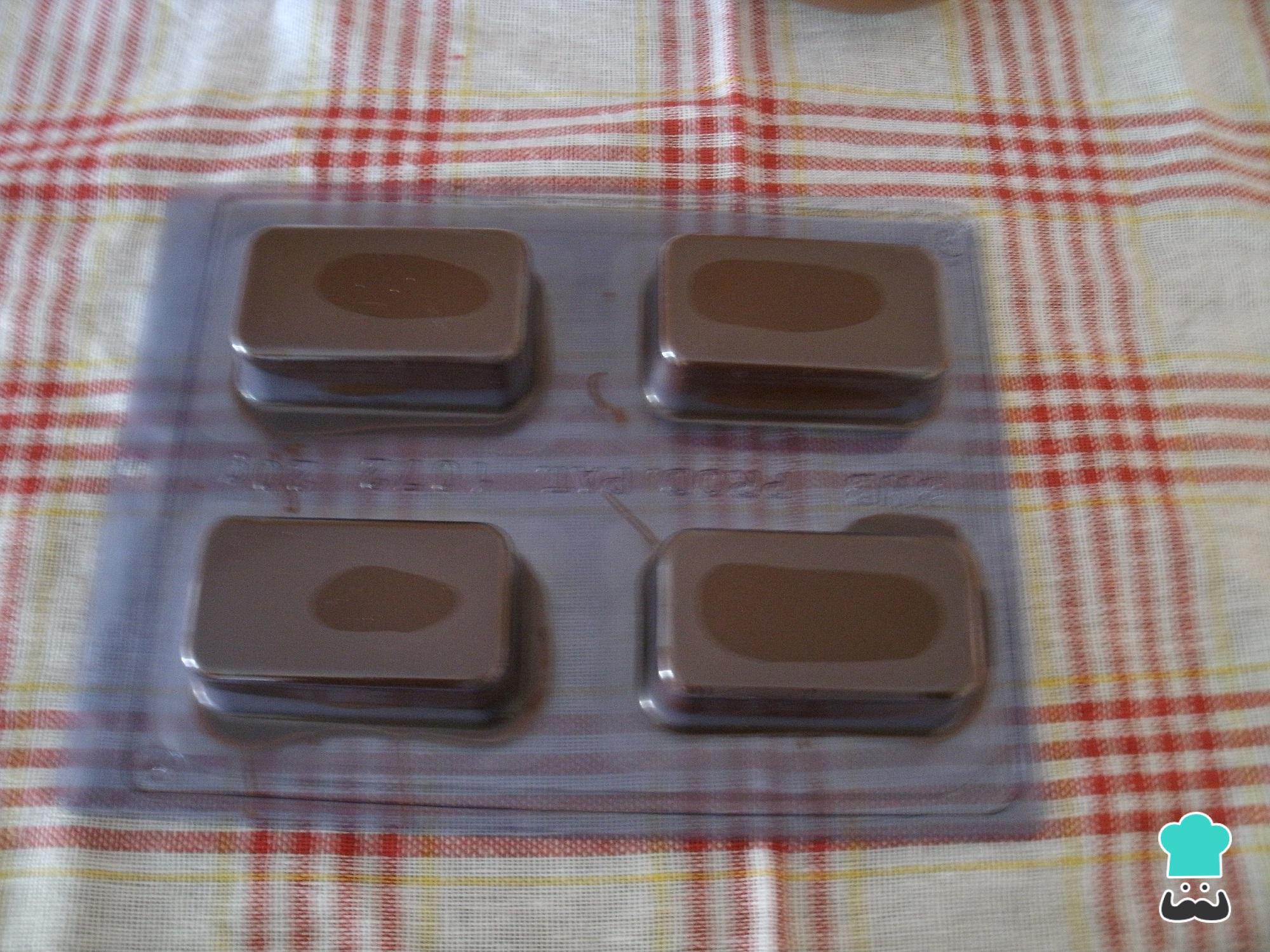 Depois do passo anterior, acrescente um pouco do recheio em cada casquinha de chocolate, bata com a forma na mesa para uniformizar, cubra com chocolate e volte a bater.