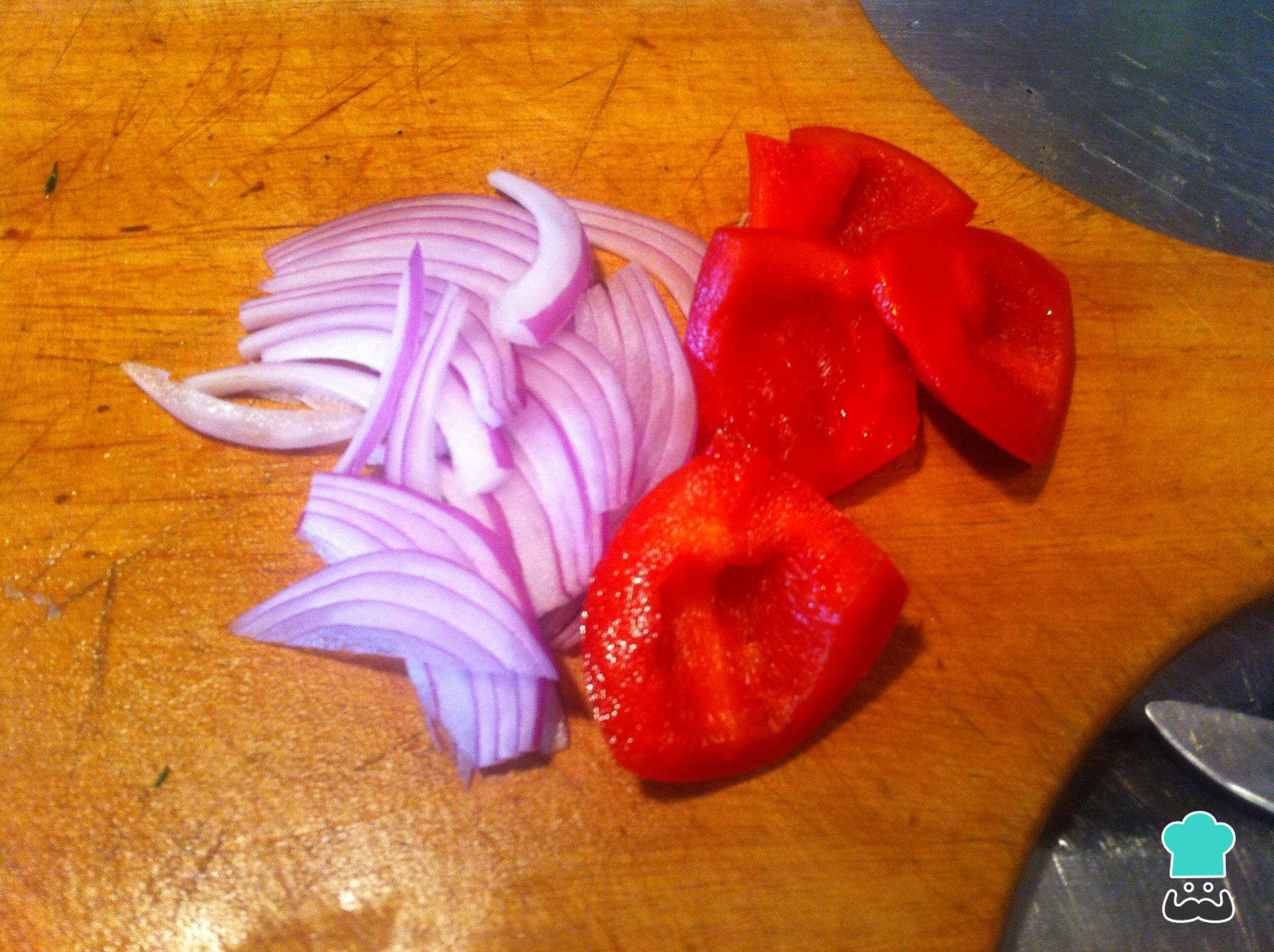 Corte a cebola em meias-luas e o pimentão em pedaços de tamanho semelhante às rodelas de abobrinha.