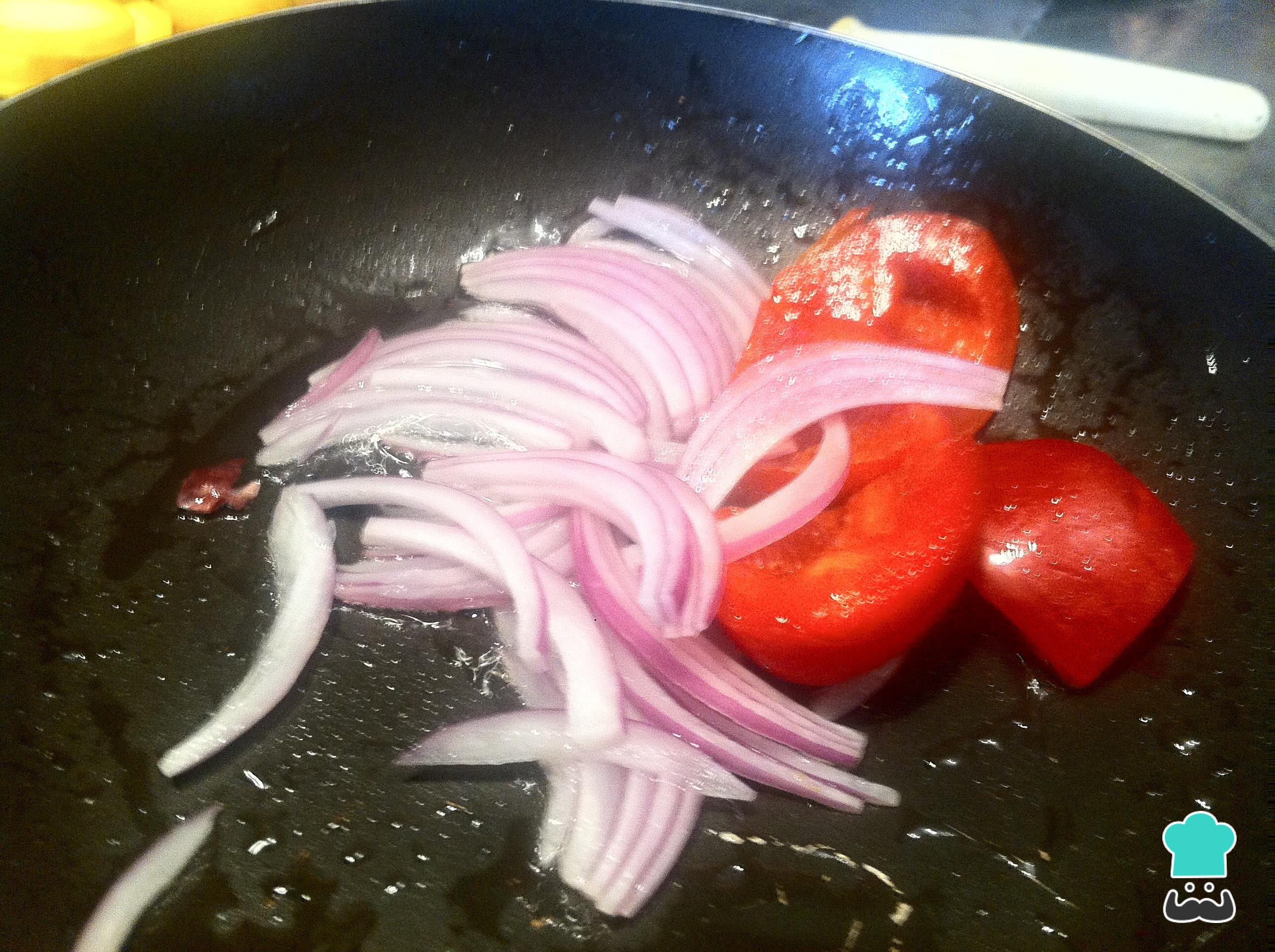 Coloque metade do óleo em uma frigideira e refogue a cebola e o pimentão em fogo médio. Enquanto isso, preaqueça o forno a 180ºC.