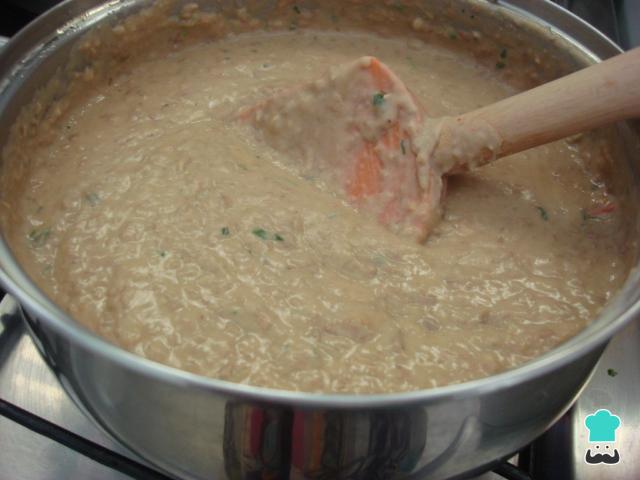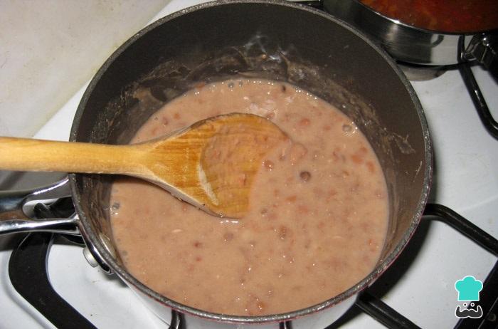 Leve ao fogo médio uma panela com a banha ou azeite, a cebola e os alhos picados. Deixe refogar até dourar e adicione a pasta de feijão.