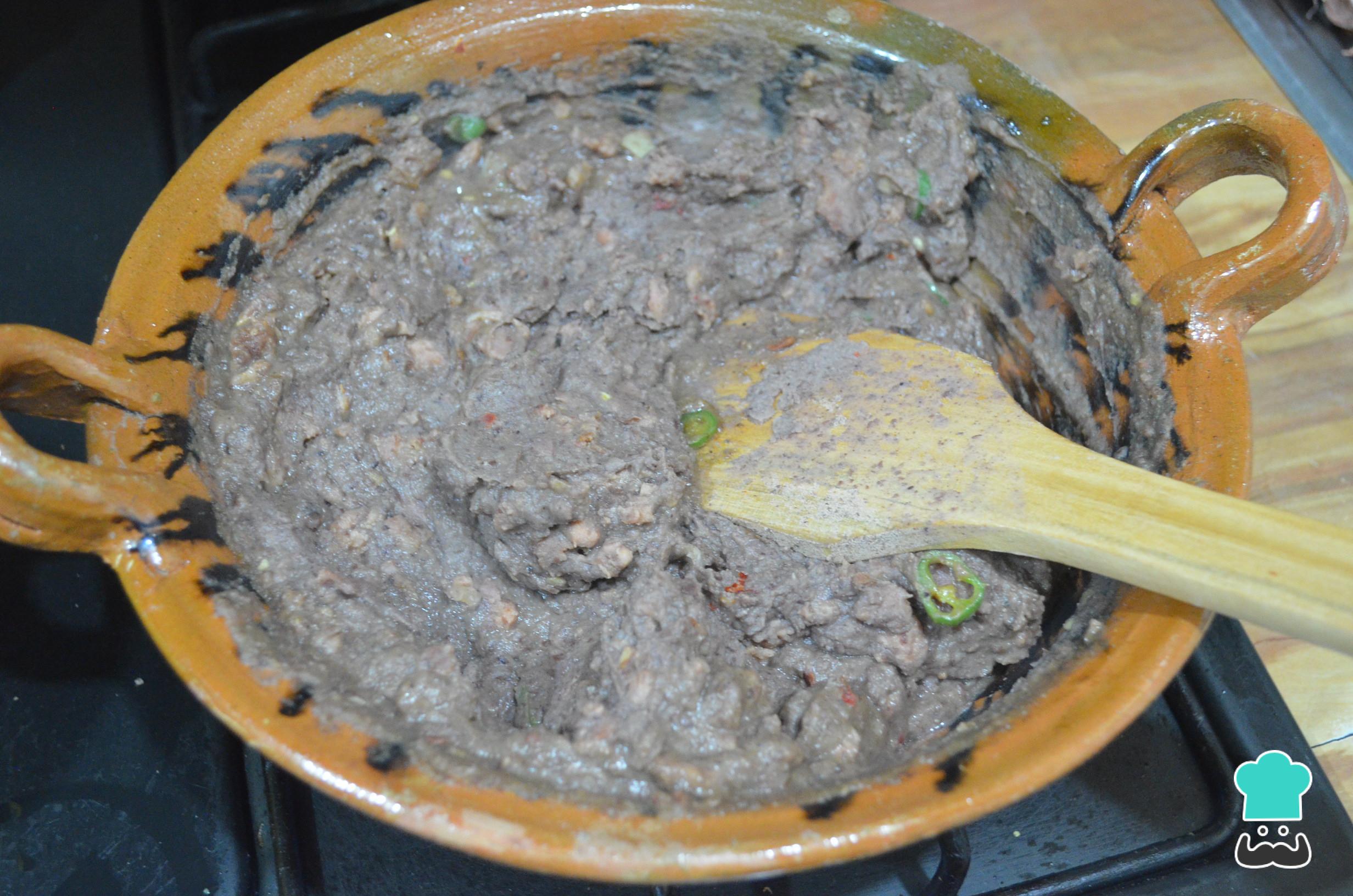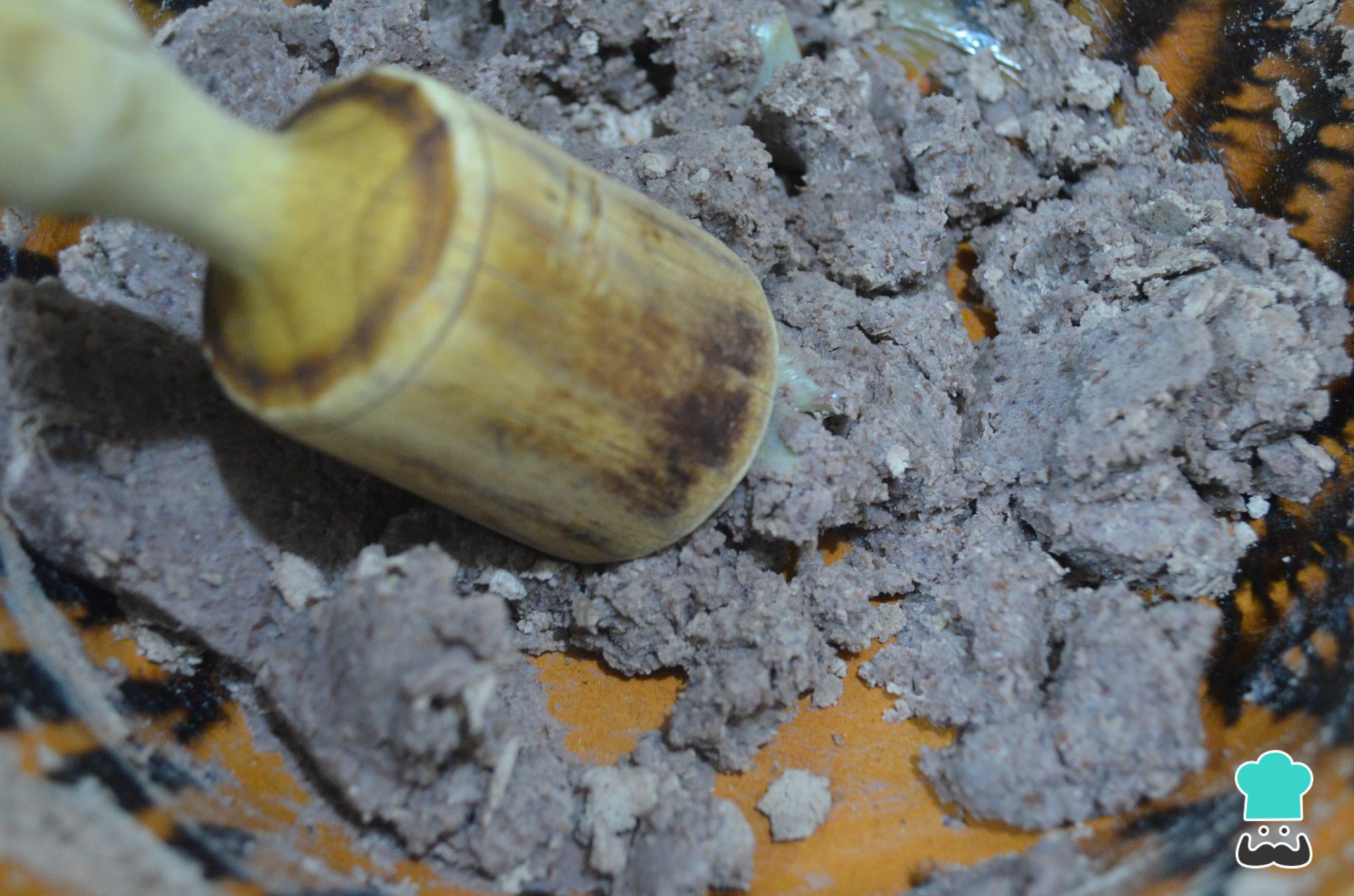 Assim que o feijão esteja cozinhado, bata no liquidificador com um pouco da água da cozedura, até obter um creme espesso. Coloque esse creme numa panela ou frigideira com óleo e fique mexendo, até secar e desgrudar. Desligue o fogo e reserve.