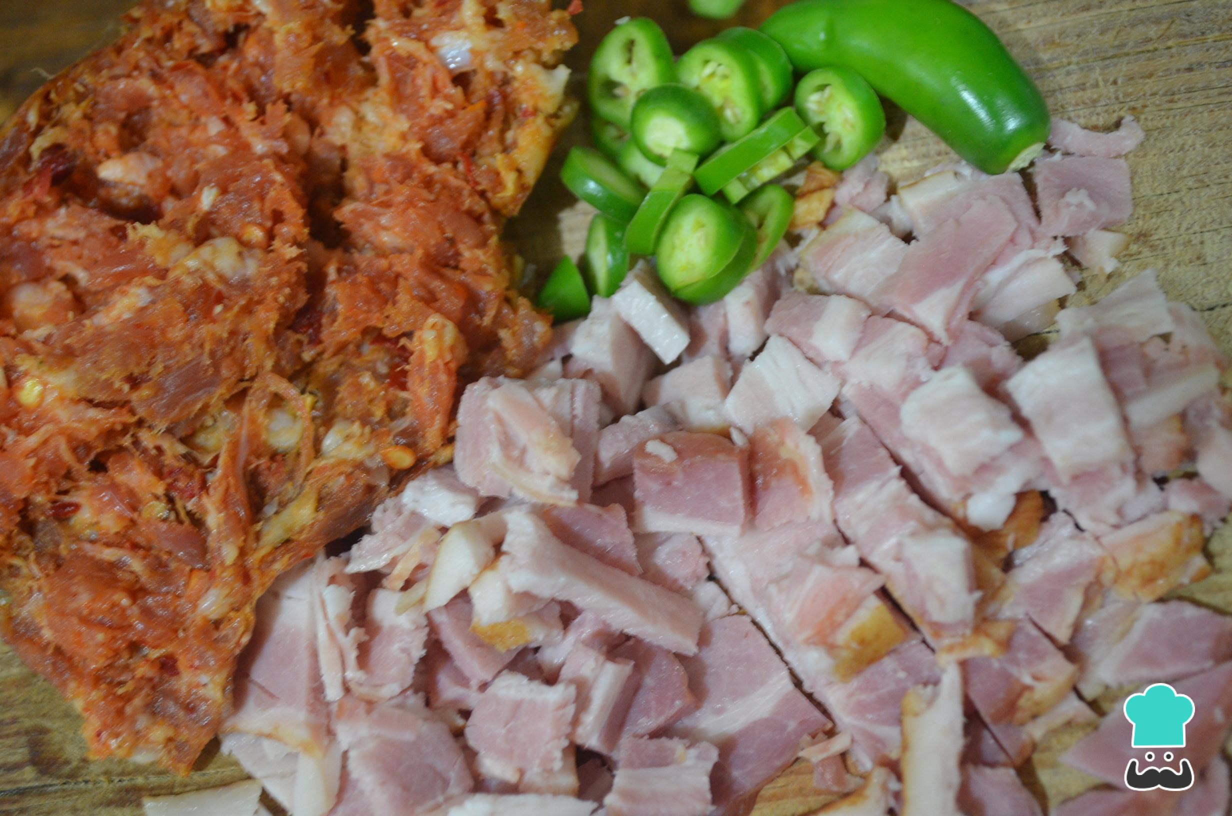 Continue preparando essa receita de tutu de feijão com bacon e linguiça, cortando em pedaços a linguiça e o bacon. Nesta receita gosto de usar também pimenta verde, mas você pode deixar esse ingrediente de fora se não gostar ou não encontrar.