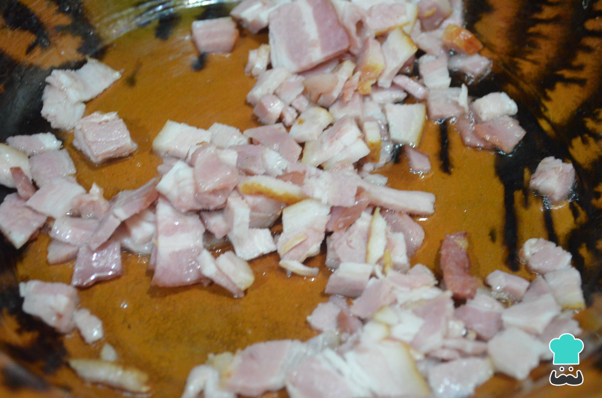 Em uma outra panela grande adicione um pouco de óleo, e quando estiver quente, frite a linguiça e o bacon.