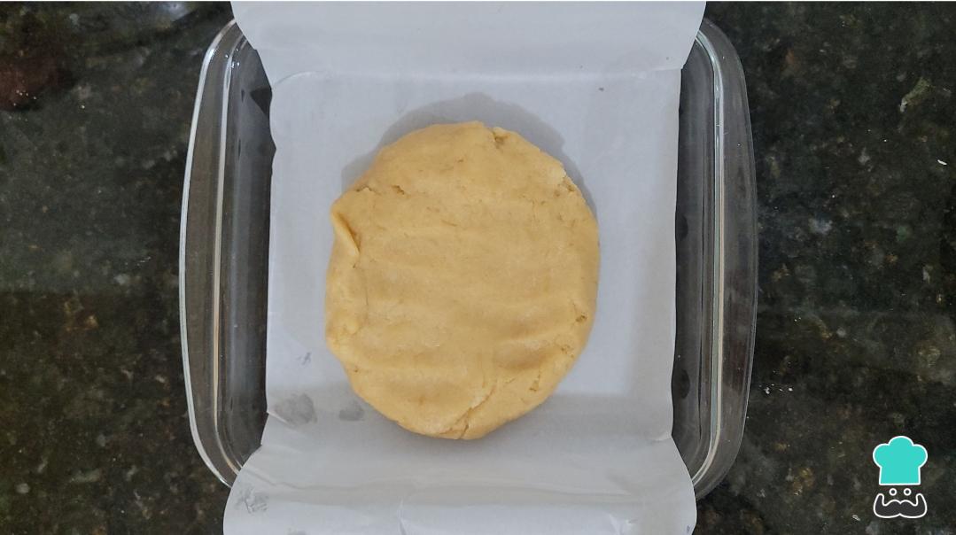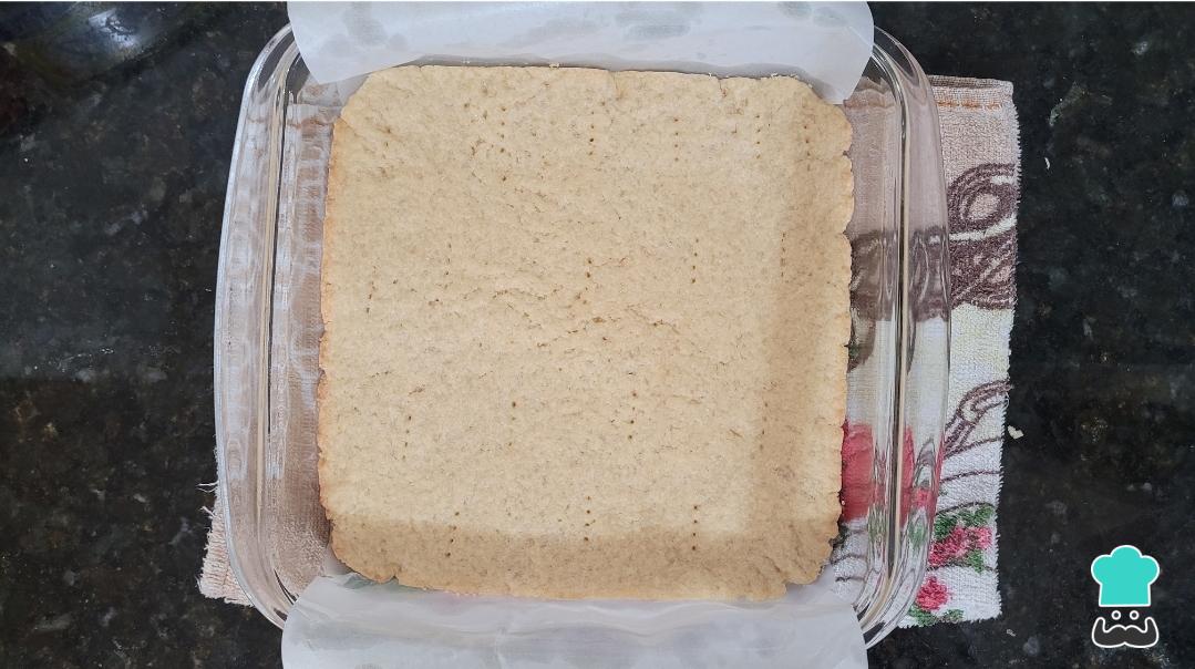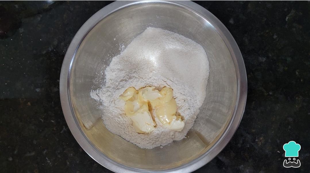 Comece fazendo a base de biscoito. Misture a farinha, o açúcar e a manteiga até que vire uma massa firme e macia.
