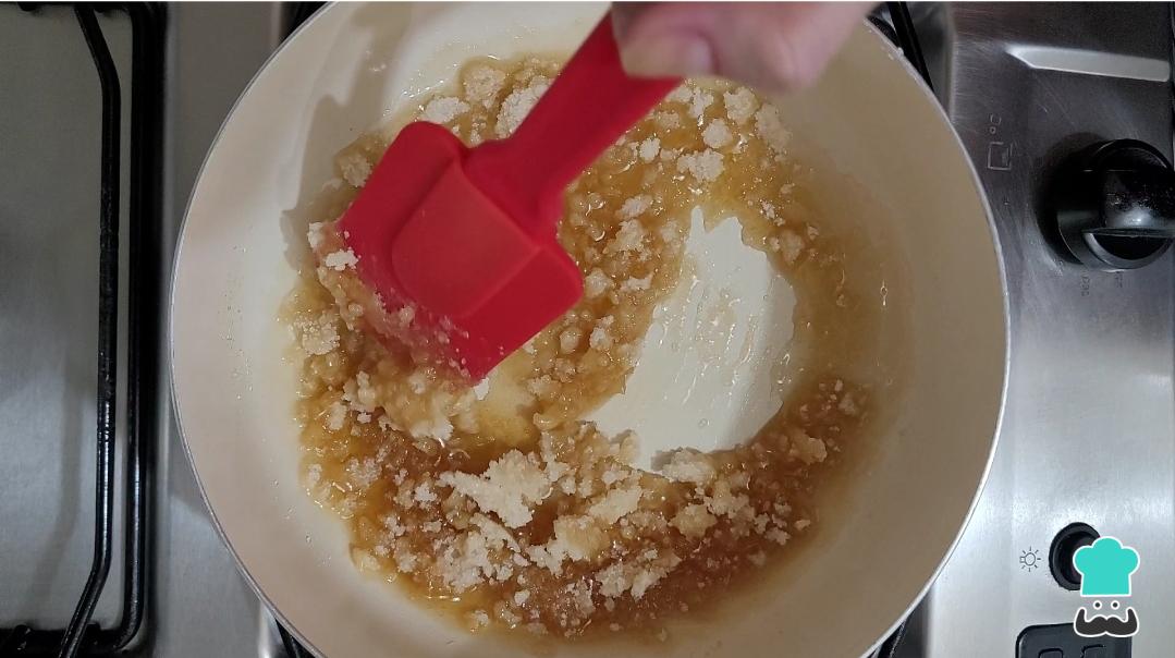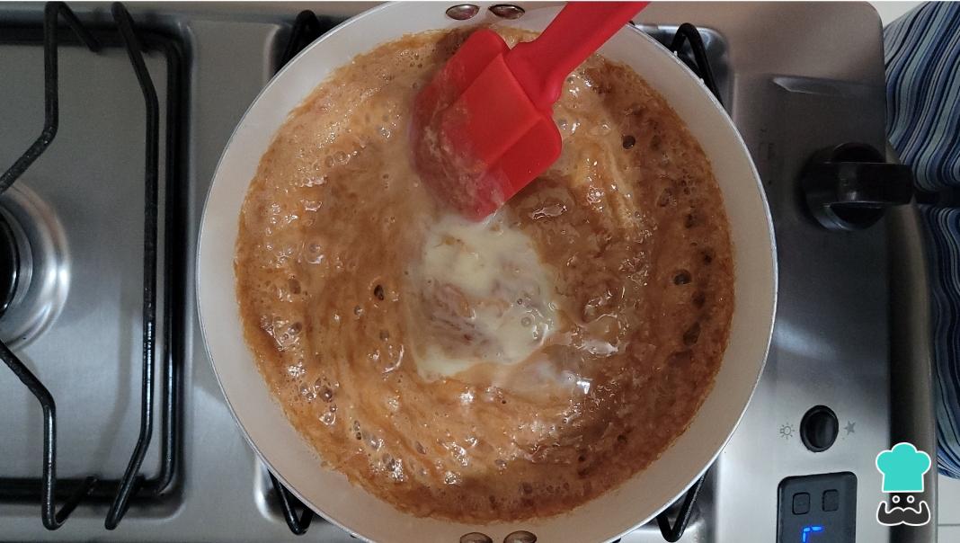 Quando ficar na cor âmbar e tiver derretido todo o açúcar, acrescente o leite condensado e continue mexendo.