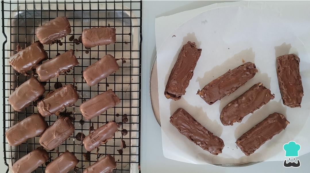 Corte o twix em retângulos do tamanho que desejar e passe o chocolate derretido em volta. Deixe gelar para criar a casquinha.