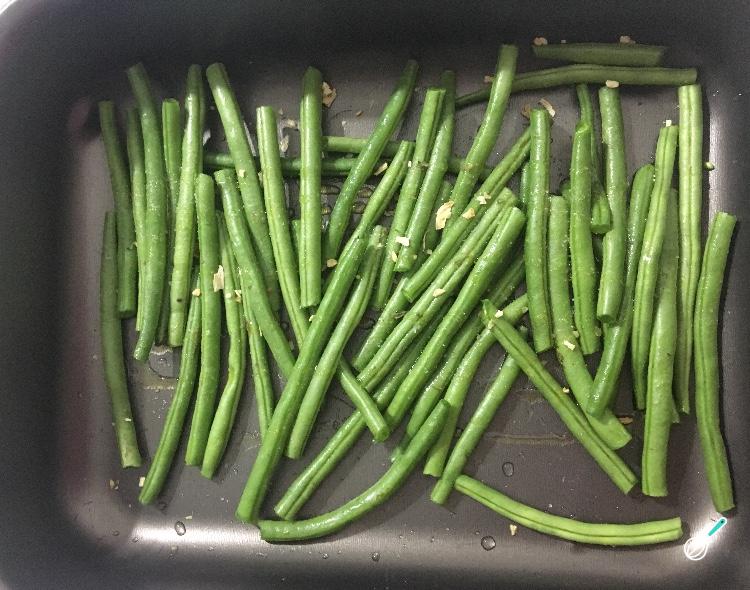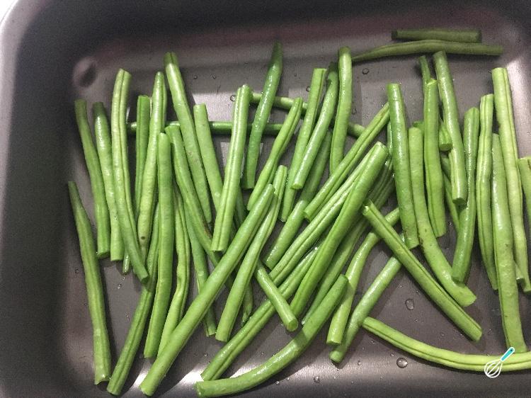 Lave as vagens, corte as pontas e coloque em uma forma ou tabuleiro de forno.