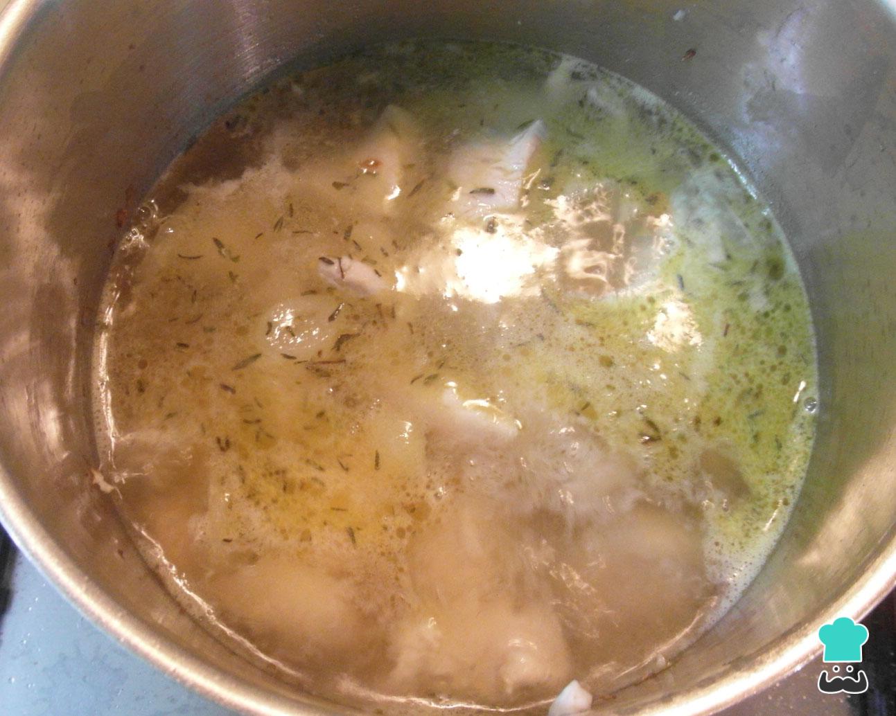 Quando o frango estiver cozido retire da água, deixe esfriar um pouco e depois desosse e desfie.