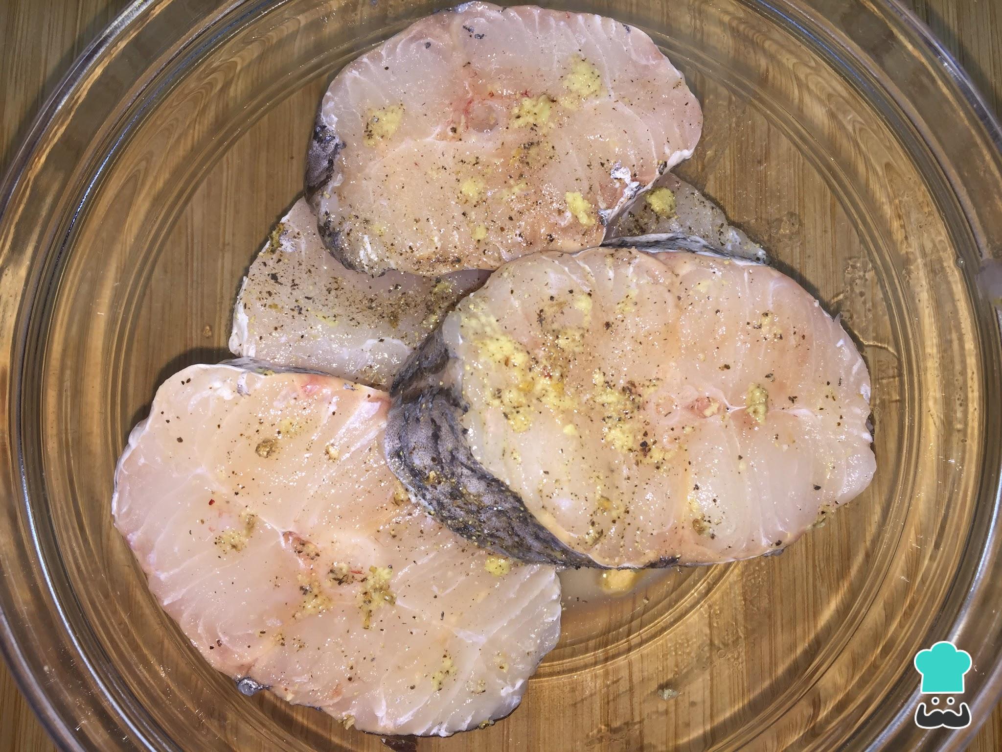 Rale o gengibre e tempere a merluza com o gengibre, a pimenta do reino e sal. Reserve.
