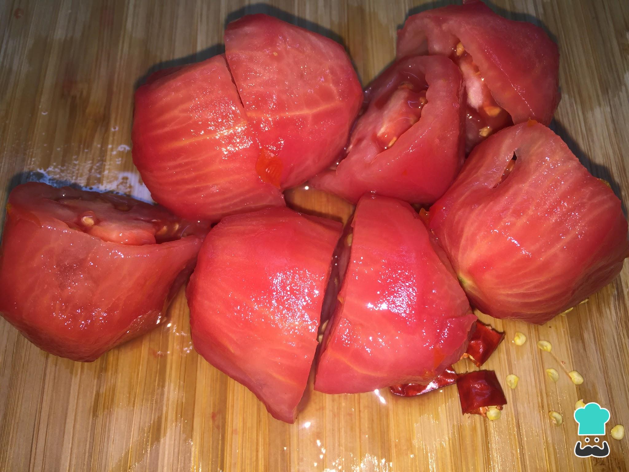 Retire a pele dos tomates e corte ao meio, juntamente com a pimenta malagueta.
