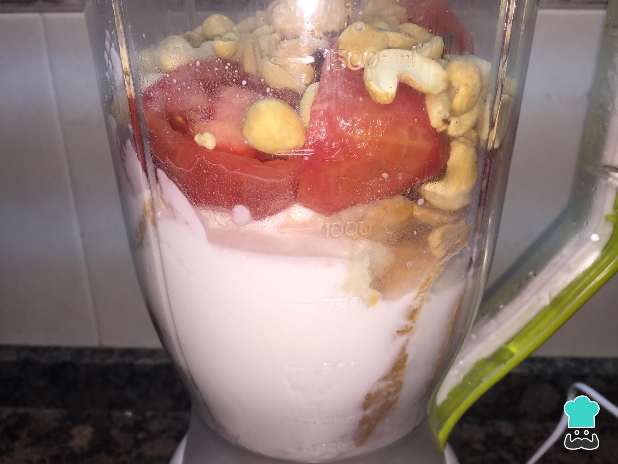 Em um liquidificador coloque o pão, o leite simples, o leite de coco, os tomates, a pimenta malagueta e os amendoins. Bata bem até obter um molho homogêneo.