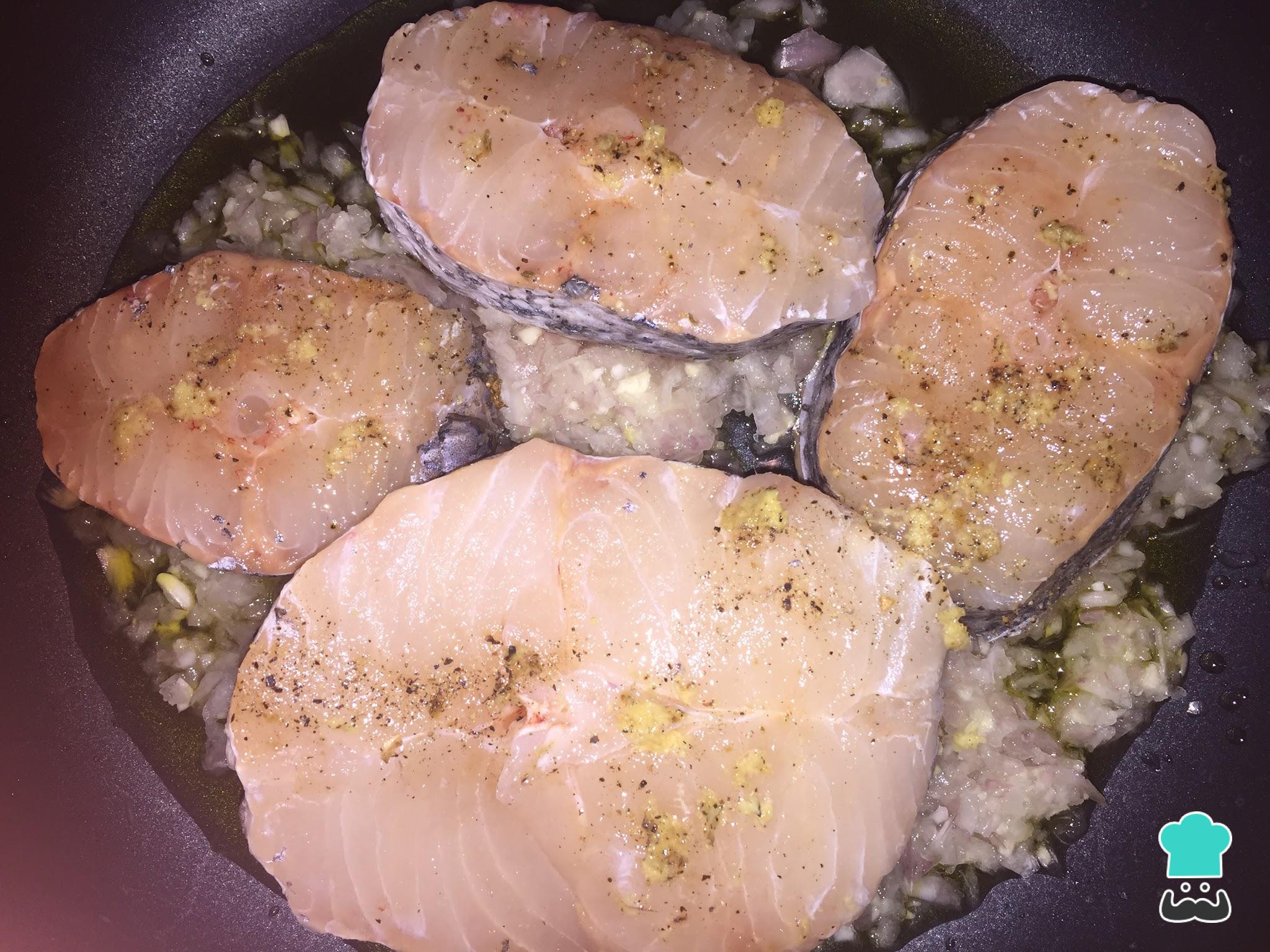Coloque o peixe em uma panela, juntamente com o azeite, a cebola e o alho picado. Deixe cozinhar dos dois lados, até ficar dourado.