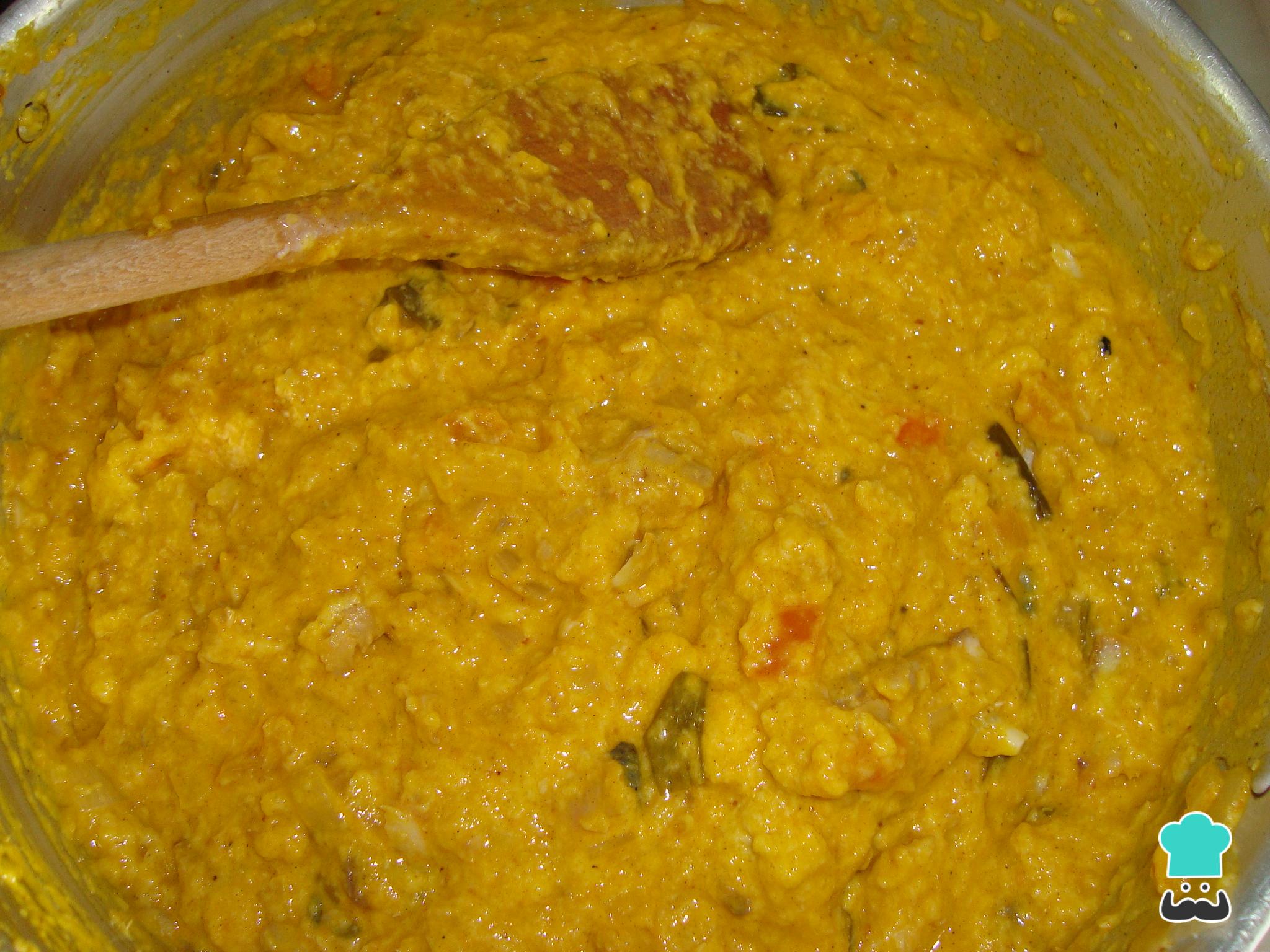 Desfaça os pães com as mãos, e adicione à panela junto com os tabletes de saldo. Fique mexendo por 20 minutos ou até engrossar, acrescentando mais leite comum ou de coco, se ficar grosso demais.