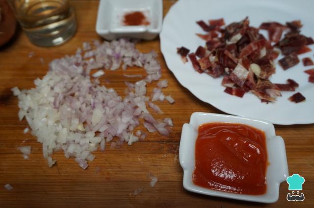 Prepare todos os ingredientes para fazer o recheio para as vieiras ao estilo galego: pique a cebola finamente e o presunto em pedaços pequenos também. Separe também o molho de tomate, a páprica, o vinho, a farinha de rosca e o azeite de oliva.