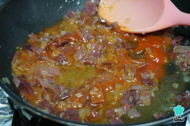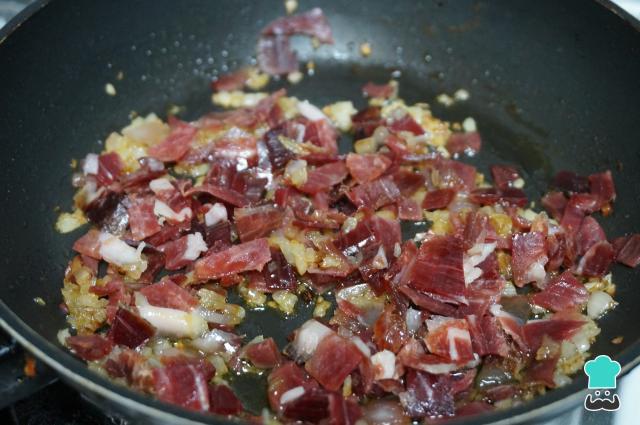 Leve uma frigideira ao fogo médio-baixo com um pouco de azeite e refogue a cebola até ficar macia. Depois adicione o presunto e deixe refogar junto por mais 1 minuto, para o presunto libertar o seu sabor.
