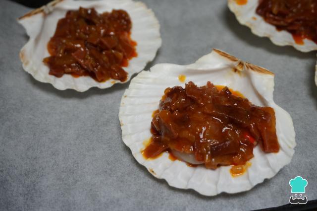 Quando o molho anterior estiver ao seu gosto, coloque as conchas com as vieiras num tabuleiro de forno e adicione um pouco do molho em cada uma, de modo a cobrir completamente as vieiras.