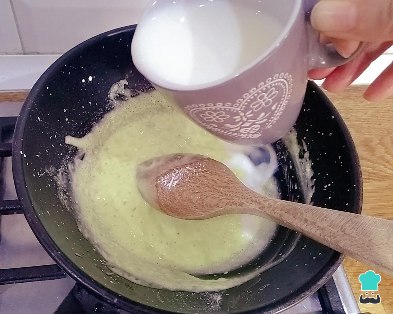 Retire do fogo, adicione o leite e misture para incorporar ele - desta forma você evitará os grumos neste molho branco caseiro. Após incorporar o leite leve a mistura de novo ao fogo médio para baixo e continue mexendo até engrossar.