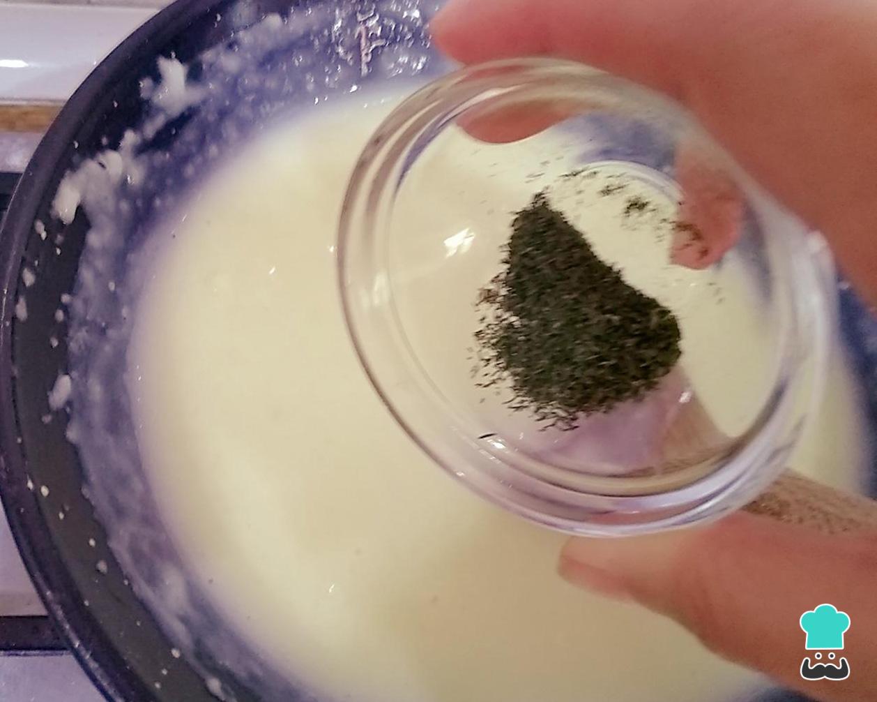 Em seguida coloque as ervas aromáticas da sua preferência. Este passo irá conferir um toque muito especial a esta receita de vieira gratinada com molho branco. Mexa por 2 minutos, desligue e reserve.