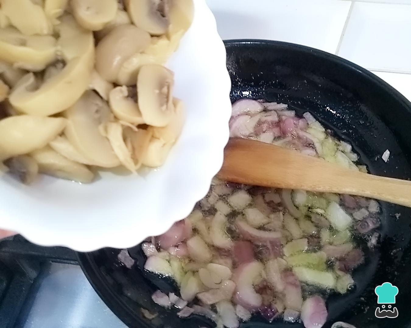 Noutra frigideira coloque um fio de azeite para começar preparando os restantes ingredientes desta receita de vieira gratinada. Quando o azeite estiver quente coloque a cebola e deixe refogar por 3 minutos. Depois coloque os champignon e refogue junto também.