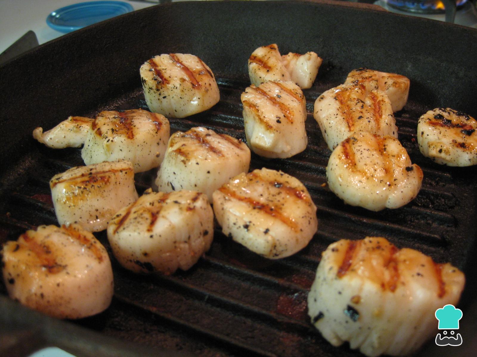 De seguida, tempere as vieiras com alho, sal e pimenta-do reino a gosto. Grelhe na frigideira (sem gordura) por um minuto e meio de um lado. De seguida, vire a vieira e grelhe do lado oposto por outro minuto e meio.