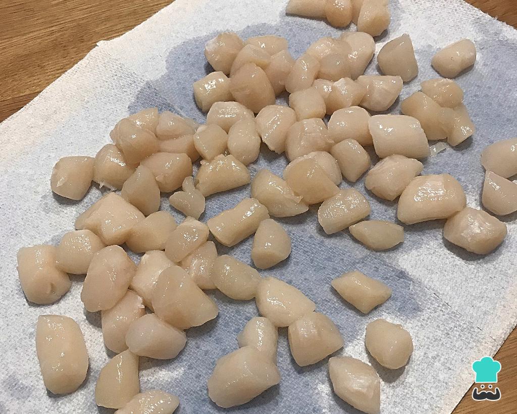 Se você estiver usando vieira congelada faça deste jeito: deixe as vieiras descongelando na geladeira e depois seque bem elas com um papel toalha - esse é um truque para ajudar a deixar elas douradinhas e a não juntar muito caldo quando colocamos na frigideira.
