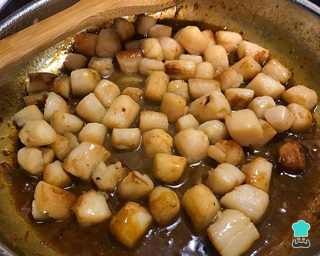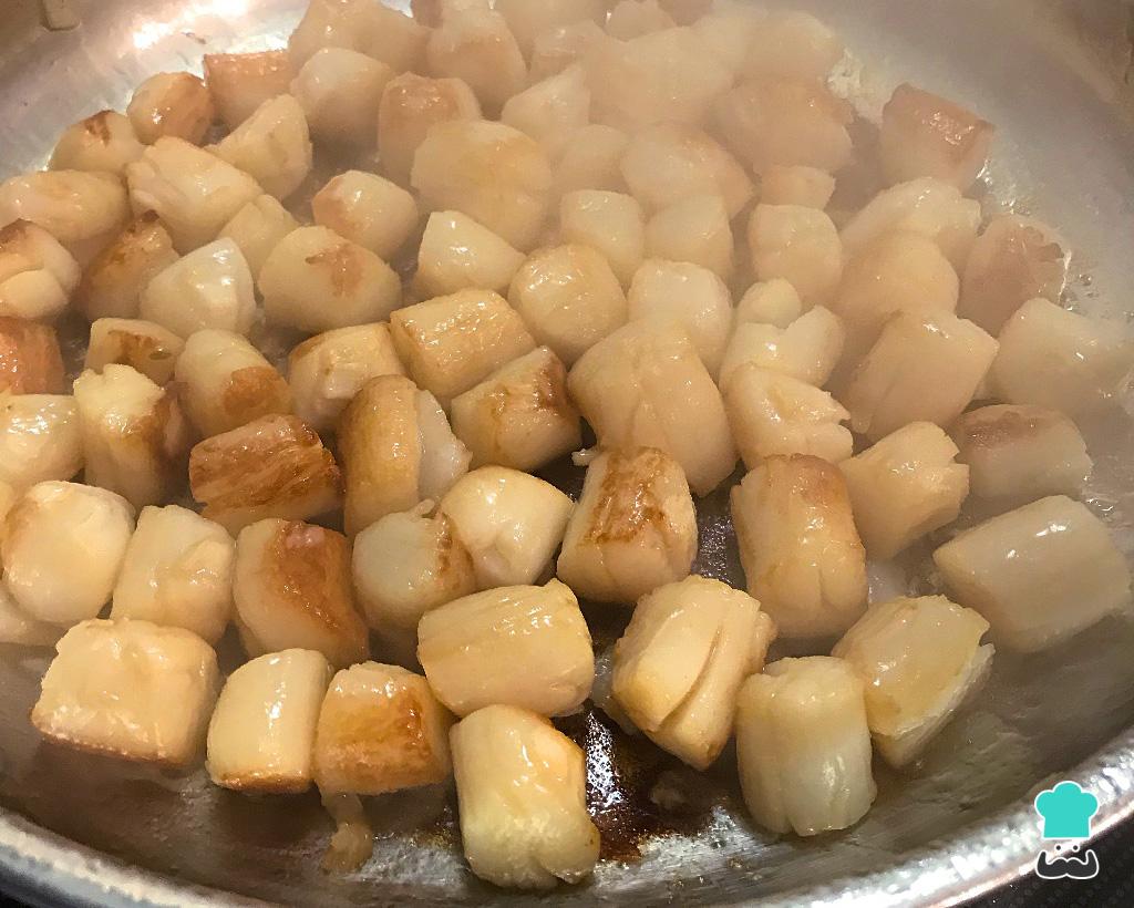 Dica: Evite ficar mexendo nas vieiras pois, quanto mais você mexe, mais caldo elas soltam, daí você acaba cozinhando as bichinhas ao invés de fritar.