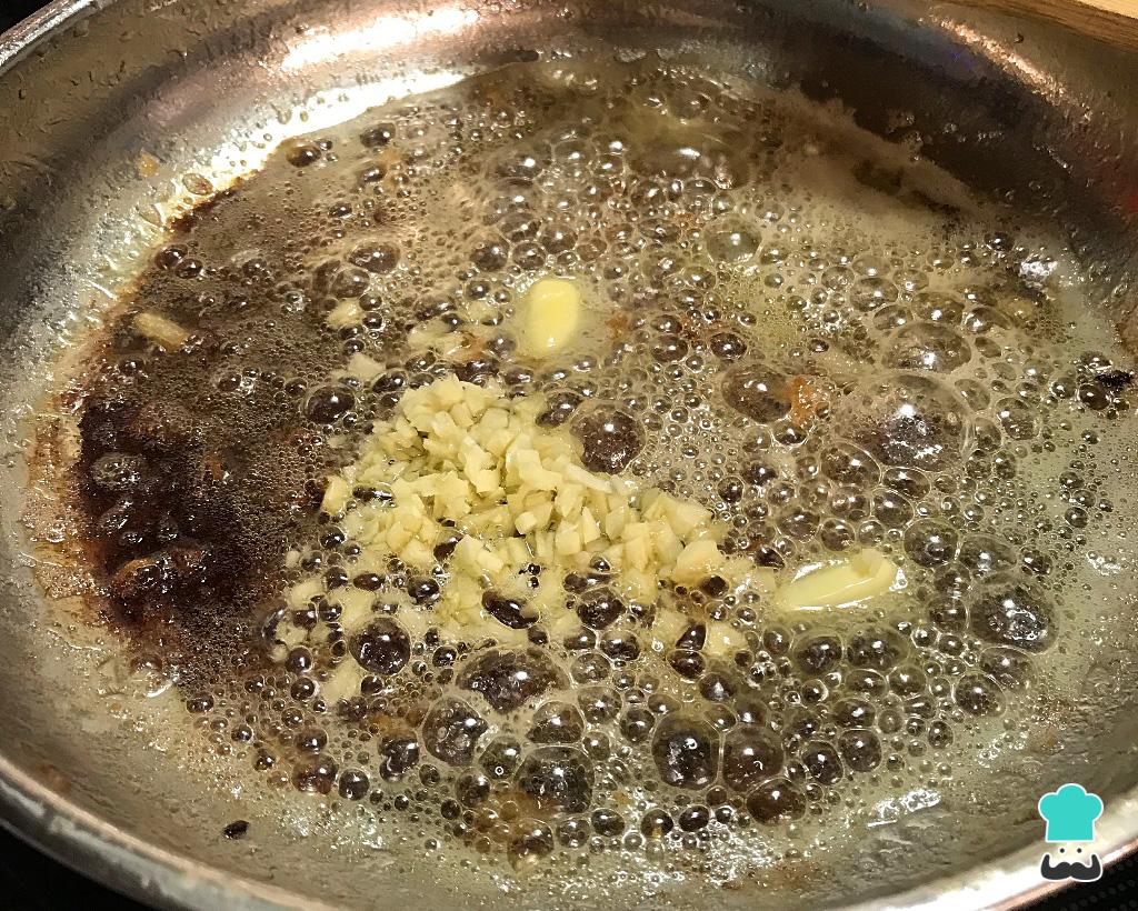 Reserve as vieiras num prato e, na mesma frigideira prepare o molho de manteiga: acrescente 2 colheres de sopa de manteiga e o alho picado. Mexa por um minutinho só, apenas até o alho soltar o aroma.