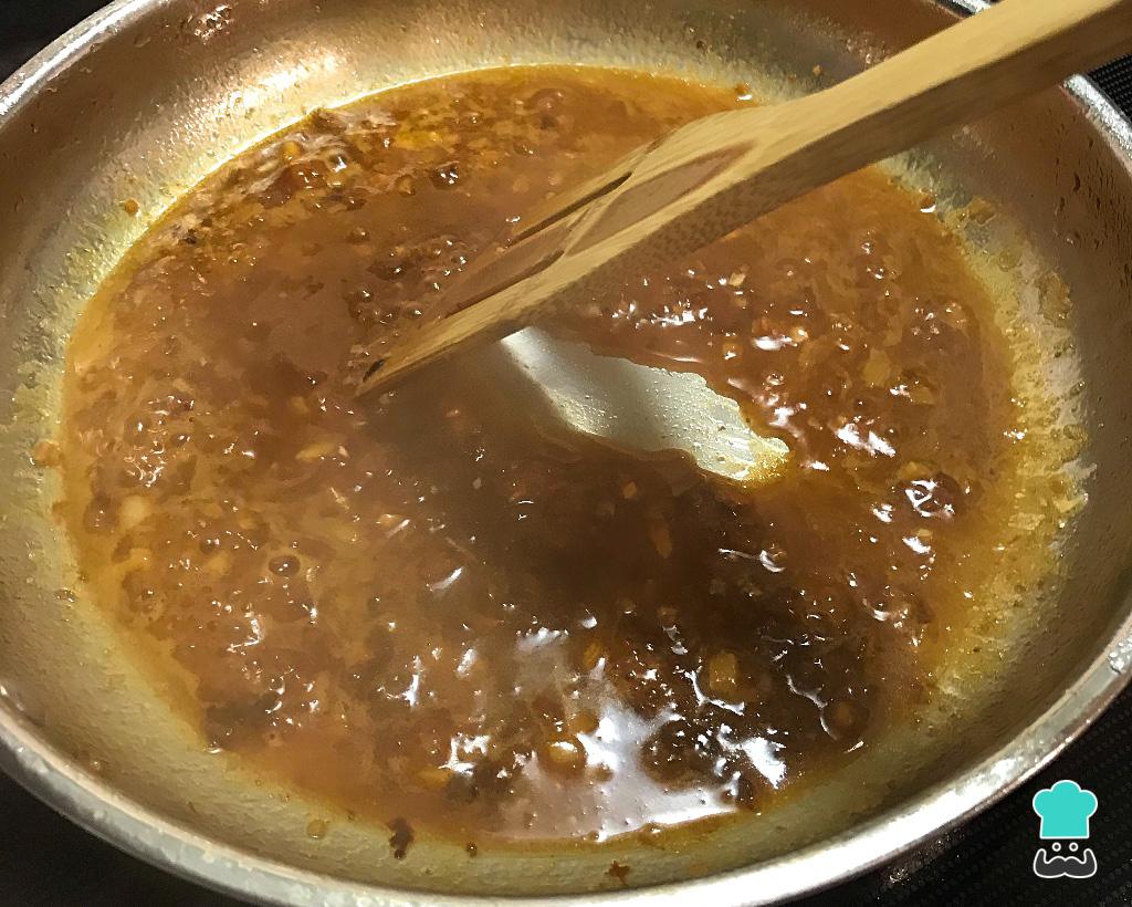 Adicione o vinho branco e raspe o fundo da frigideira com uma colher (é nesse fundo de panela que está o sabor!). Mexa até a mistura reduzir para a metade e começar a soltar do fundo da frigideira, como na foto.