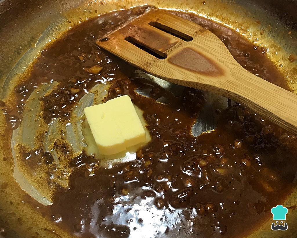 Abaixe o fogo, adicione o restante da manteiga (1 colher de sopa) e levemente balance a frigideira, até a manteiga derreter.