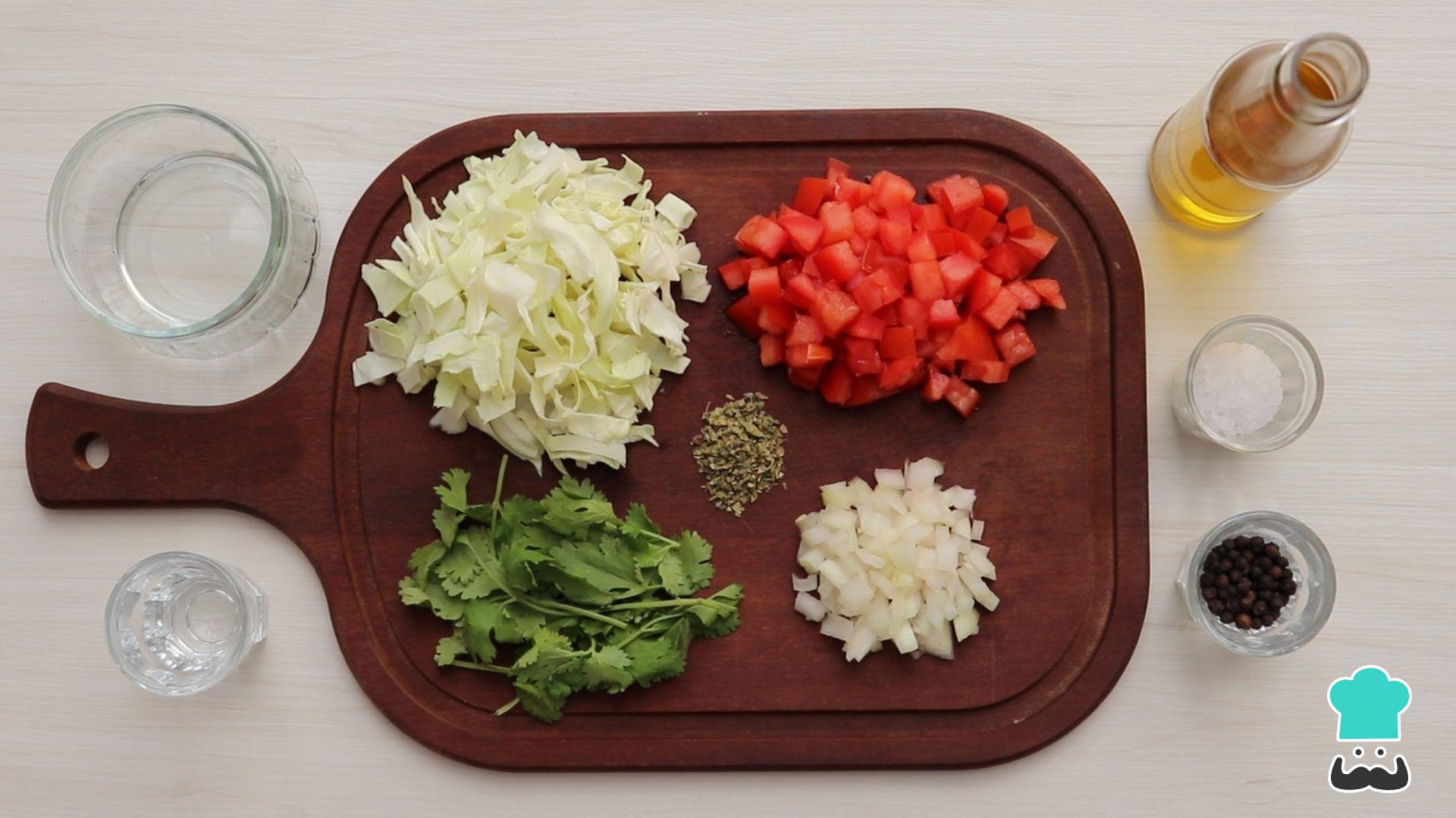 Separe os ingredientes e faça o pré-preparo cortando o repolho com tiras, a cebola e o tomate em cubos e picando o coentro.