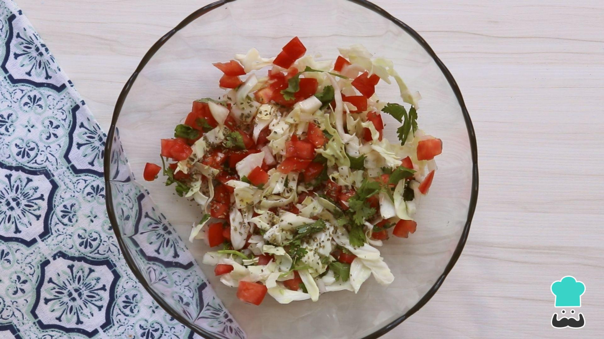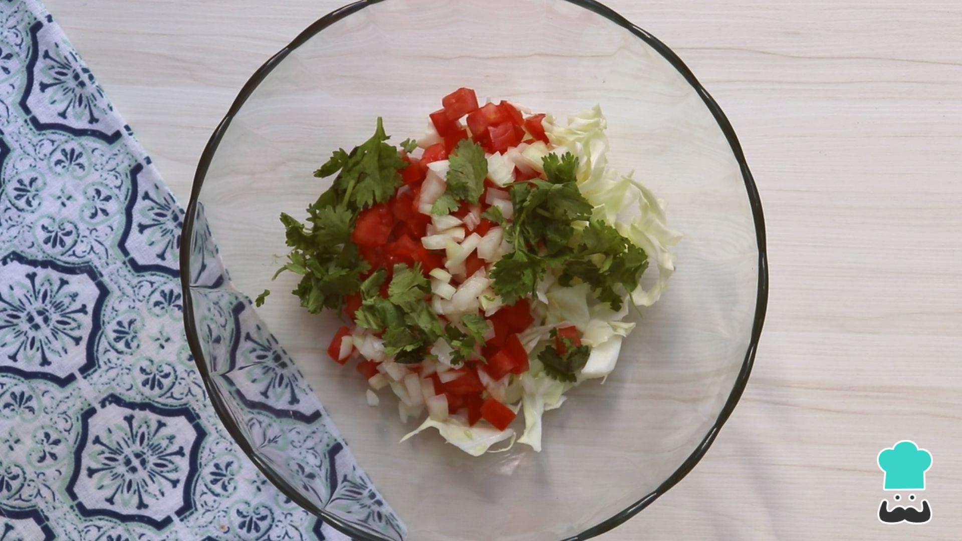 Em uma tigela misture o tomate, a cebola o repolho e o coentro.