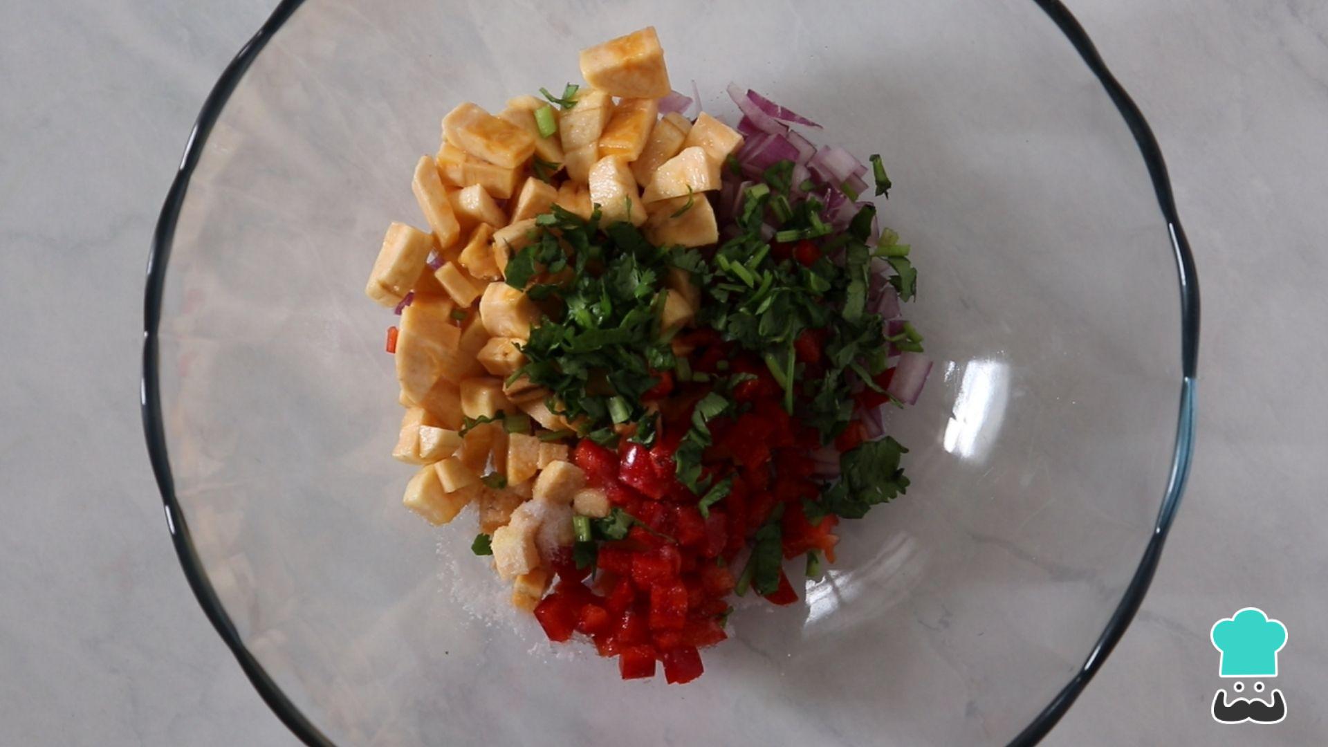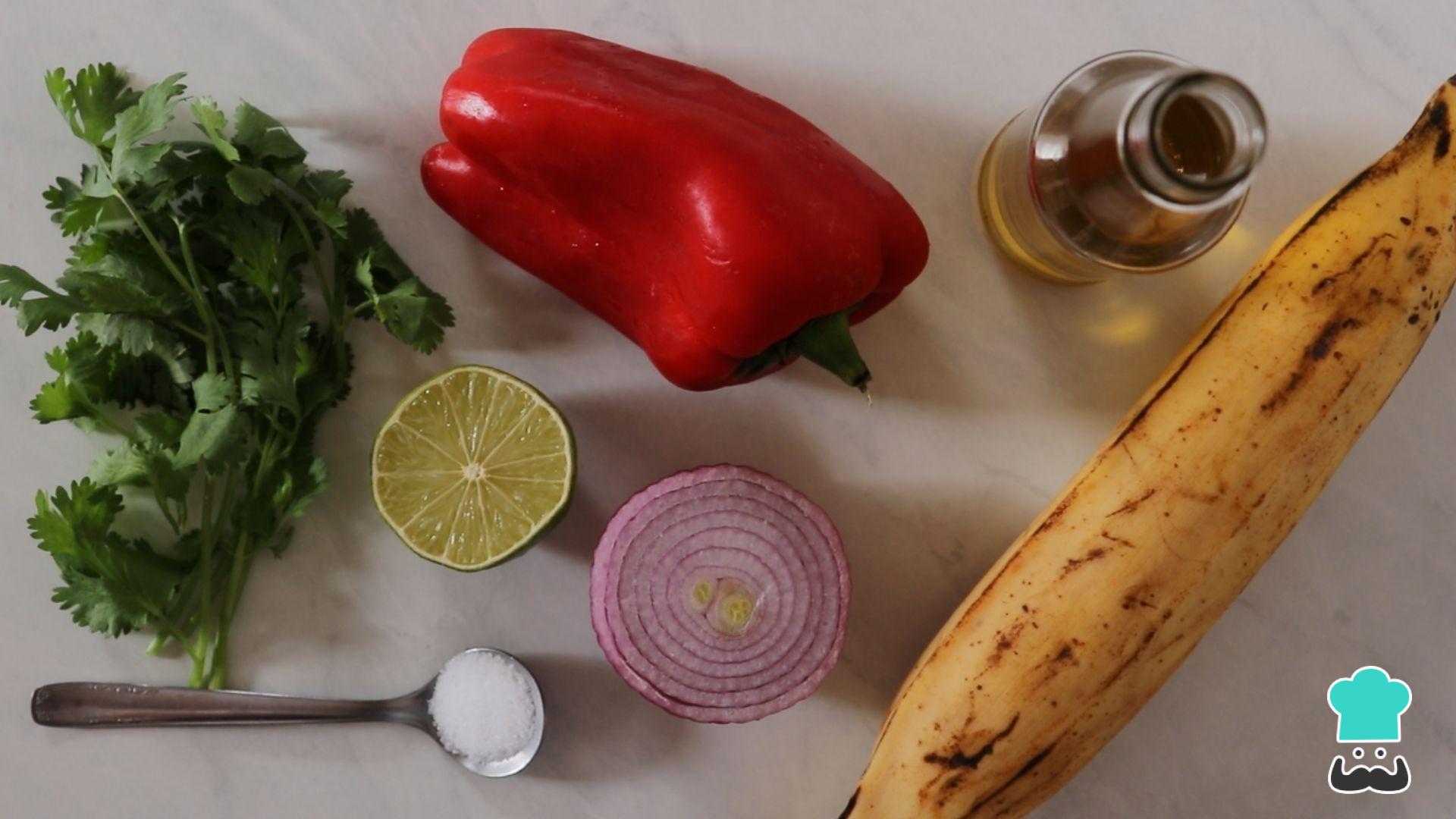 Coloque o pimentão, a banana, a cebola e o coentro em uma tigela e tempere com uma pitada de sal.