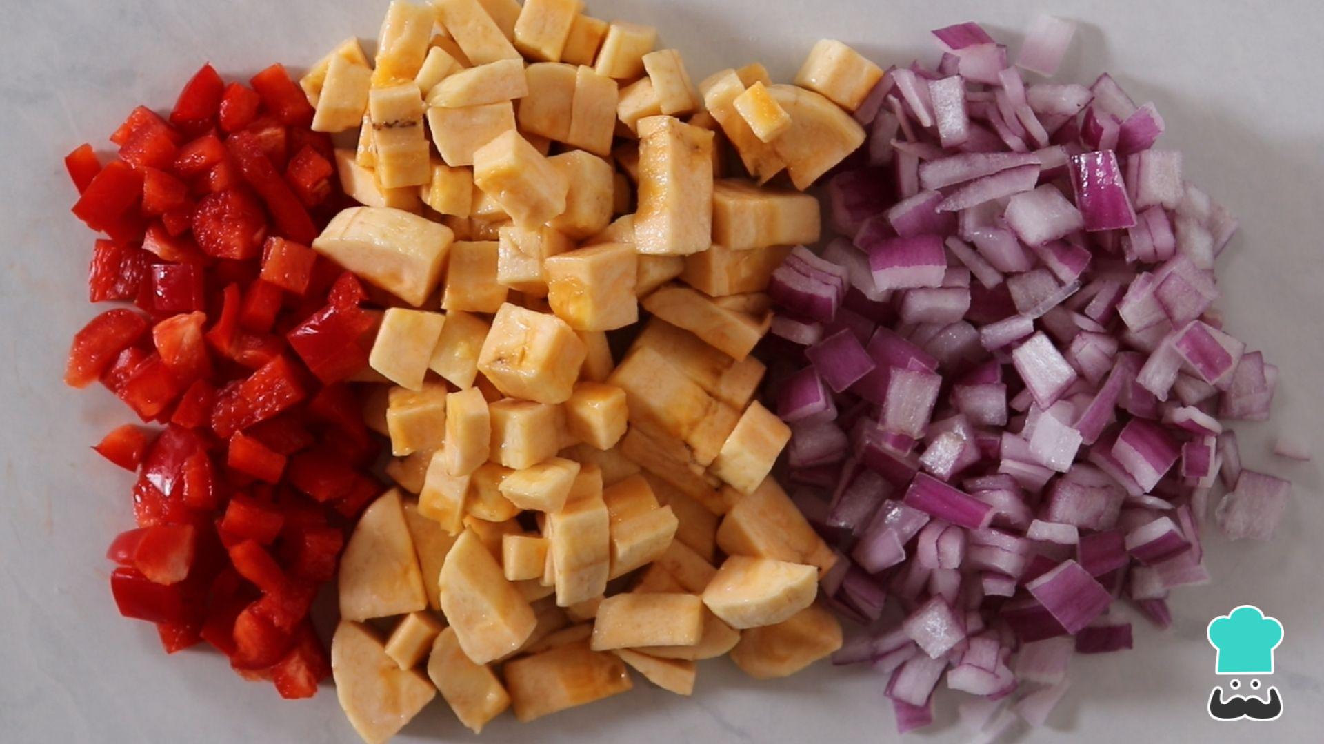 Comece picando em cubinhos o pimentão vermelho, a banana e a cebola roxa. Pique também o coentro.