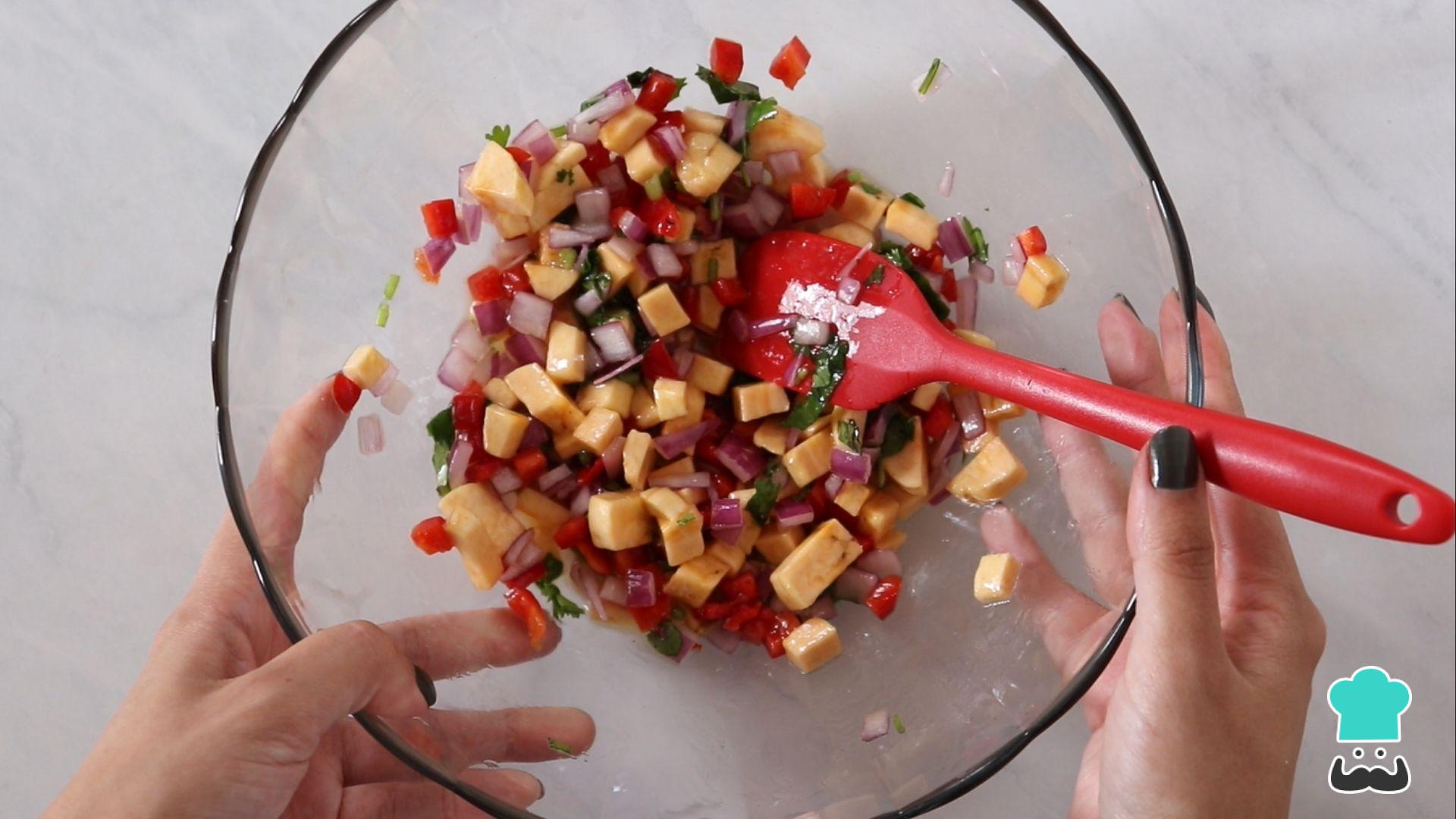 Dica: Pique esses ingredientes em cubinhos com mais ou menos o mesmo tamanho, para o vinagrete ficar bem bonitinho e ser mais fácil de servir.