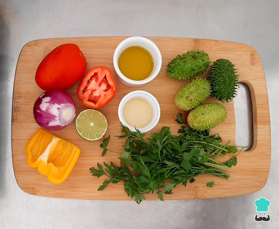 Separe os ingredientes que serão utilizados nesta receita de salada de maxixe, a fim de que fique mais fácil e prático o seu preparo.
