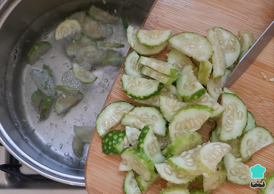 Corte os maxixes em fatias ou em meias-luas e leve-os para aferventar com água por cerca de 1 minuto, para que amoleçam um pouco.