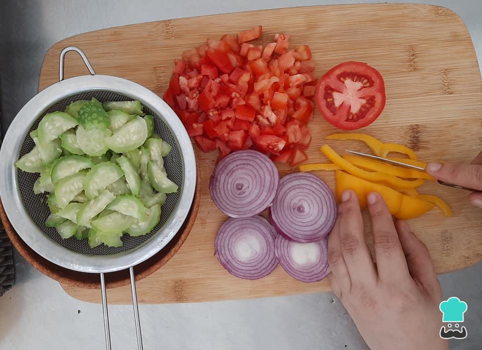 Deixe o maxixe escorrendo e corte os tomates, a cebola e o pimentão em cubinhos.