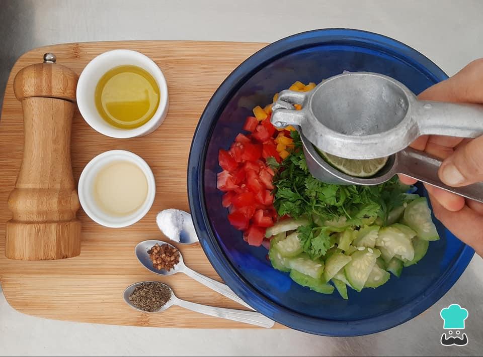 Junte todos os ingredientes (incluindo o cheiro verde e o maxixe) numa tigela e tempere tudo com sal, pimenta do reino, pimenta calabresa, ervas finas, limão, azeite de oliva e vinagre.