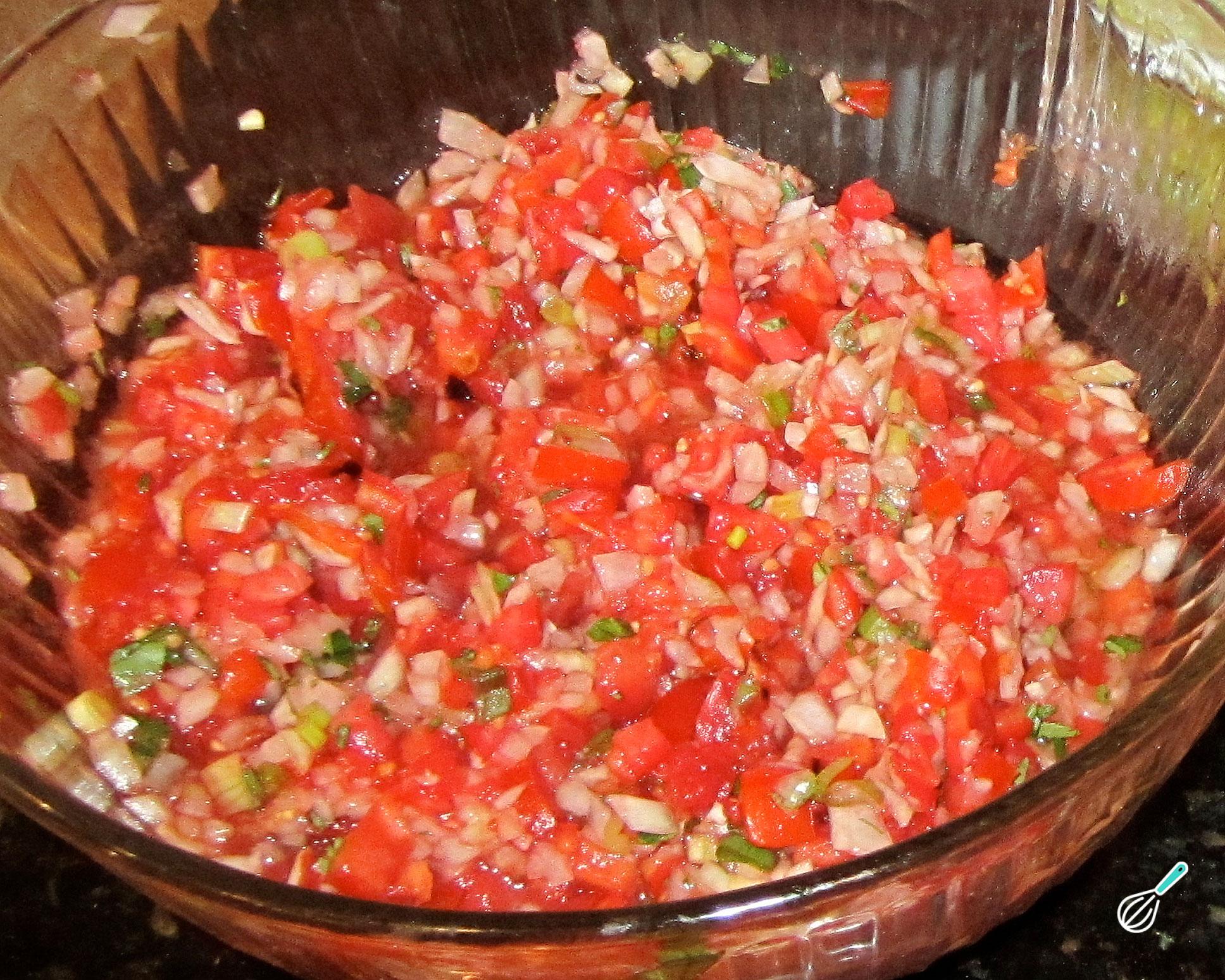 Para picar tomates e pimentões de um jeito fácil e rápido aperte com a palma da mão as metades de tomate contra a tábua de corte, de modo que os tomates fiquem planos, com a parte suculenta virada para baixo. Usando uma faca afiada corte em tirinhas e depois em cubos do mesmo tamanho que as cebolas. Faça do mesmo jeito com o pimentão.