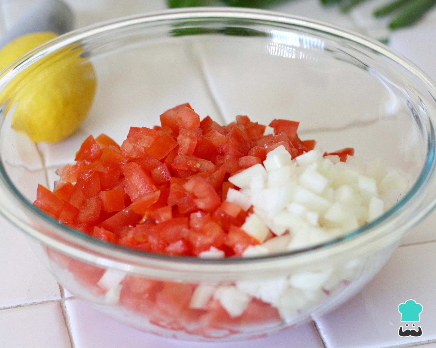 Em seguida pique as cebolas em pedaços pequenos. Faça o mesmo com os pimentões e com os tomates, retirando-lhes as sementes. Pique também o cheiro verde ou salsinha e coloque tudo numa tigela.