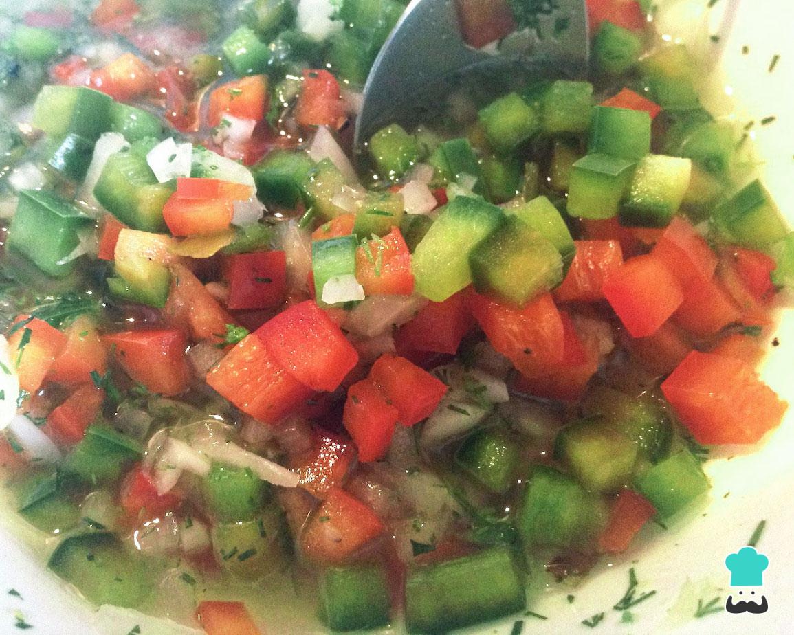 - Retire a quantidade de vinagrete desejada com uma escumadeira, para escorrer os líquidos e conseguir um vinagrete sequinho;