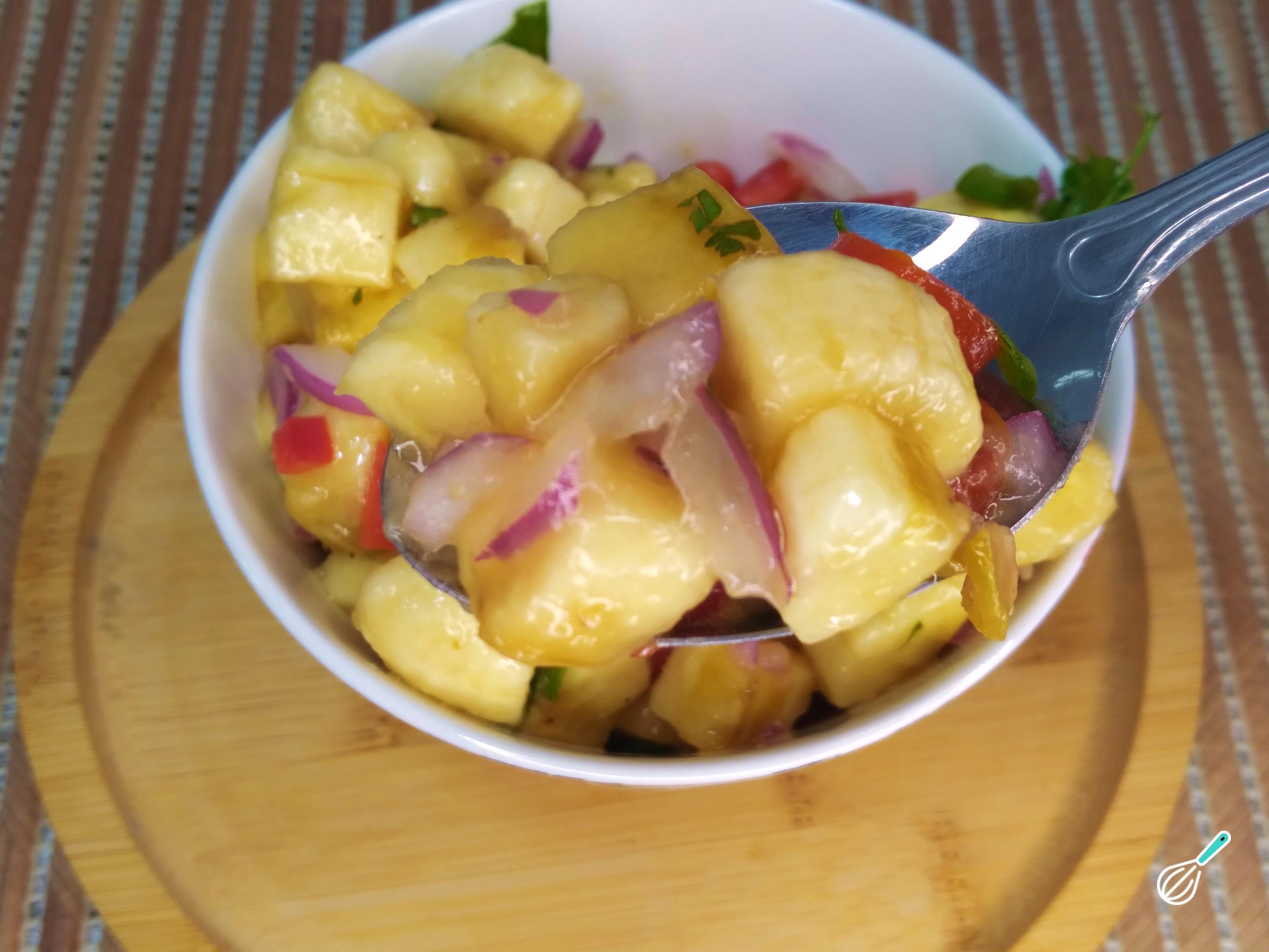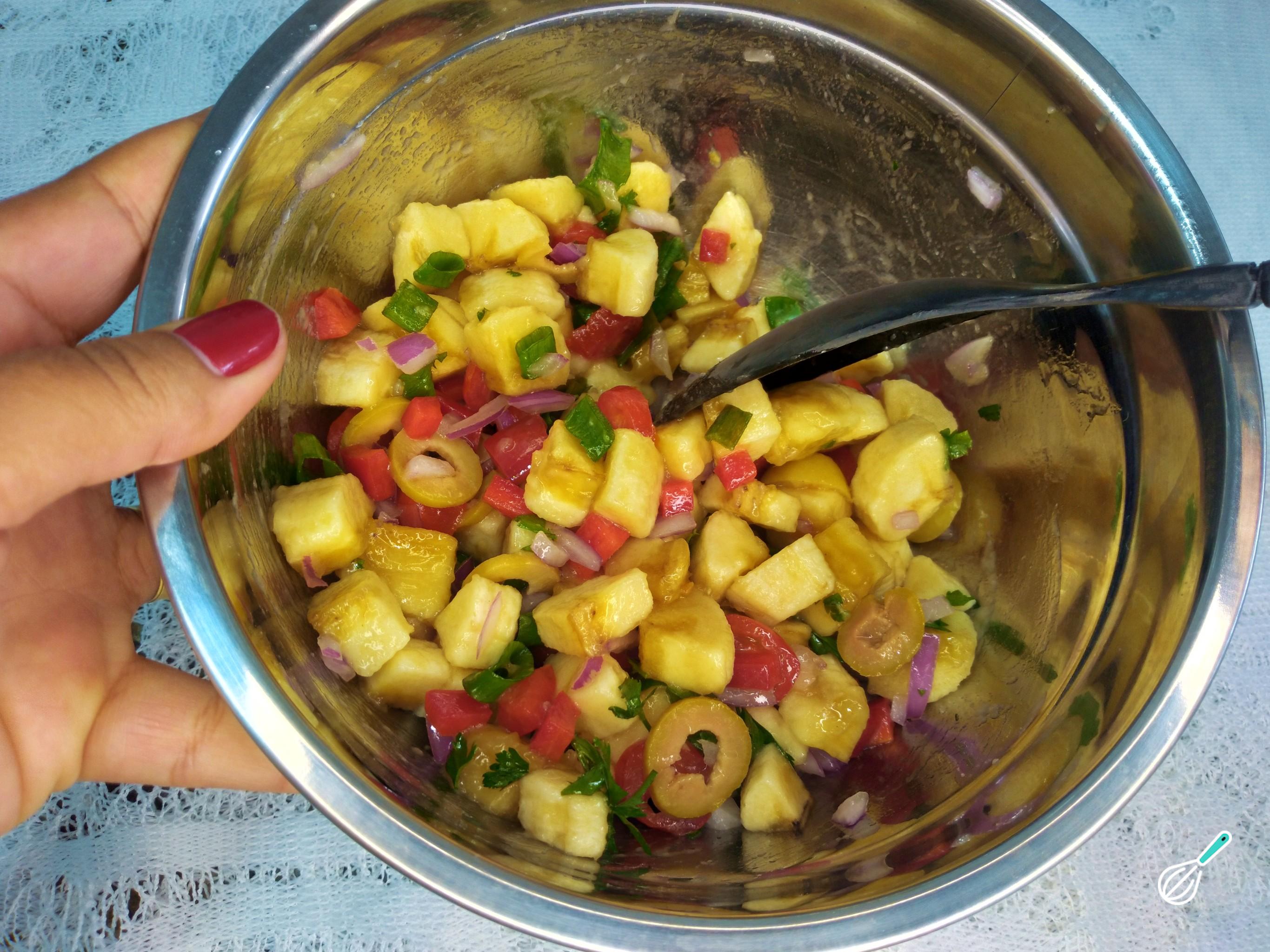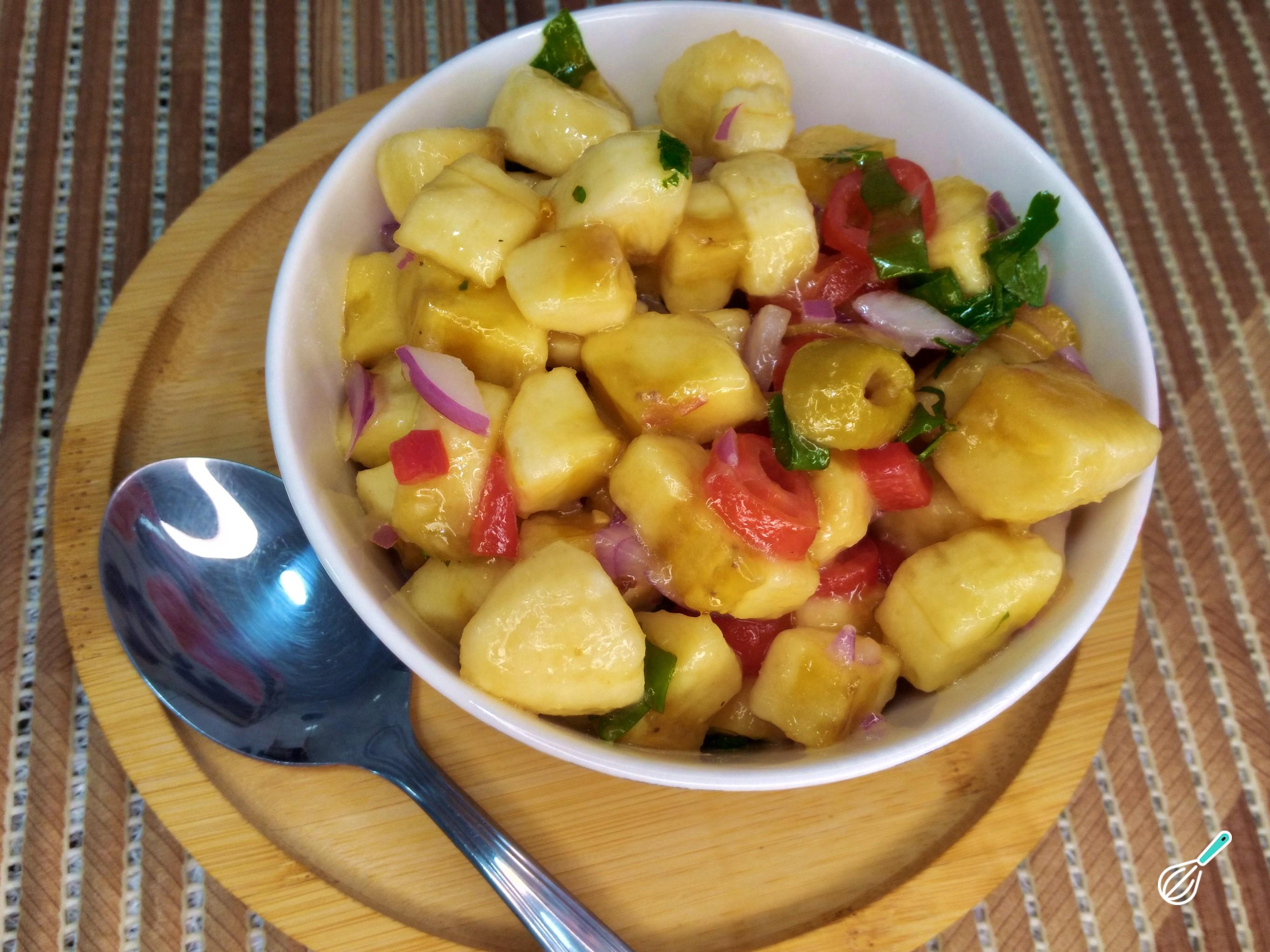 E temos uma vinagrete de banana-da-terra. Um prato delicioso e refrescante. Um acompanhamento perfeito para seu churrasco de domingo. Que tal preparar aí na sua casa e nos contar o que achou dessa receita?