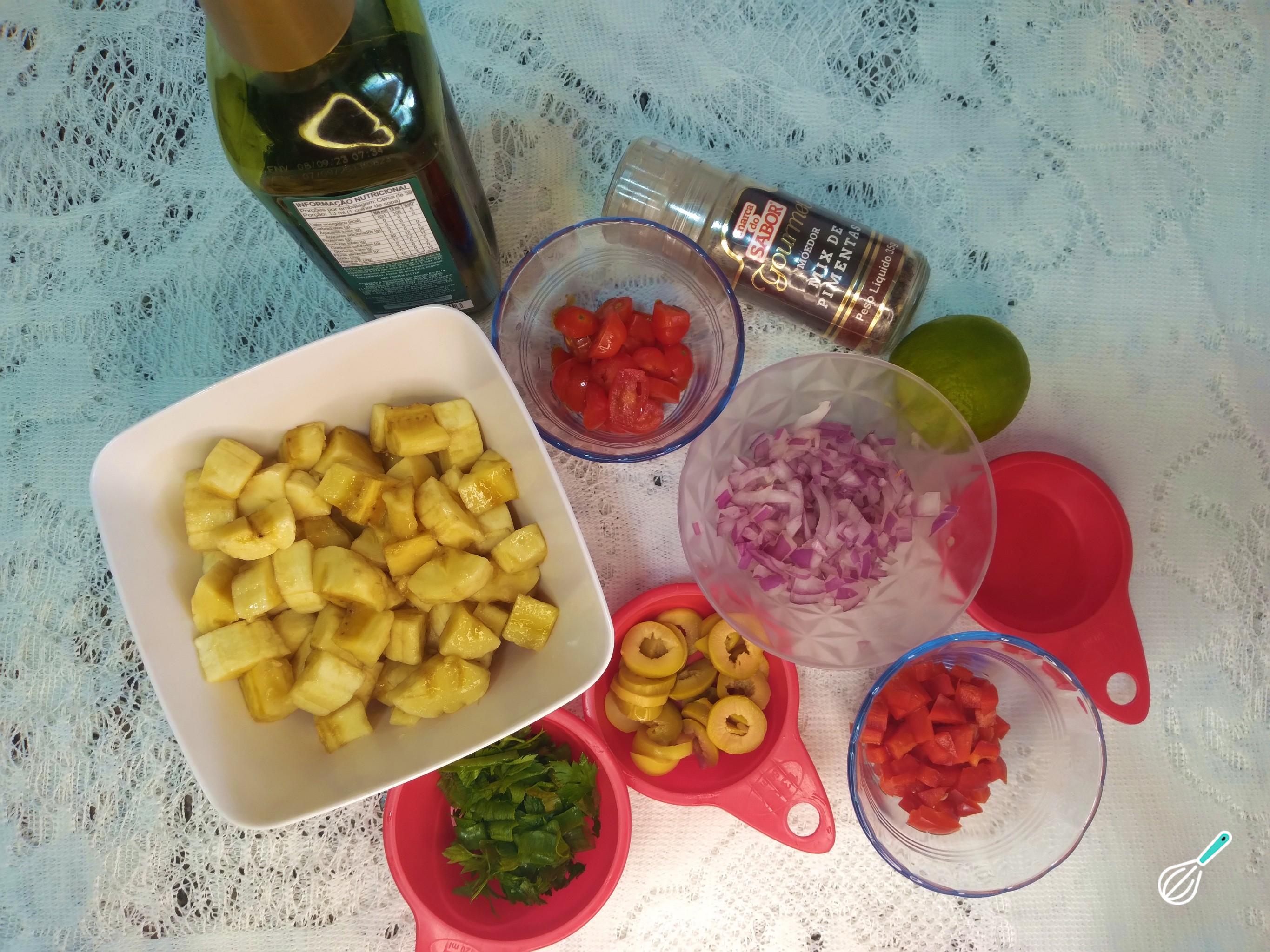 Comece separando os ingredientes da sua receita. Separe as bananas-da-terra e corte em quatro pedaços, para que fiquem de um tamanho razoável. Corte o pimentão em tiras e em seguida, em cubinhos pequenos. A cebola roxa, corte também em cubos pequenos. A cebolinha corte em pedaços fininhos. As azeitonas corte também em pedaços pequenos e finos. Os tomates cerejas corte em rodelinhas finas.