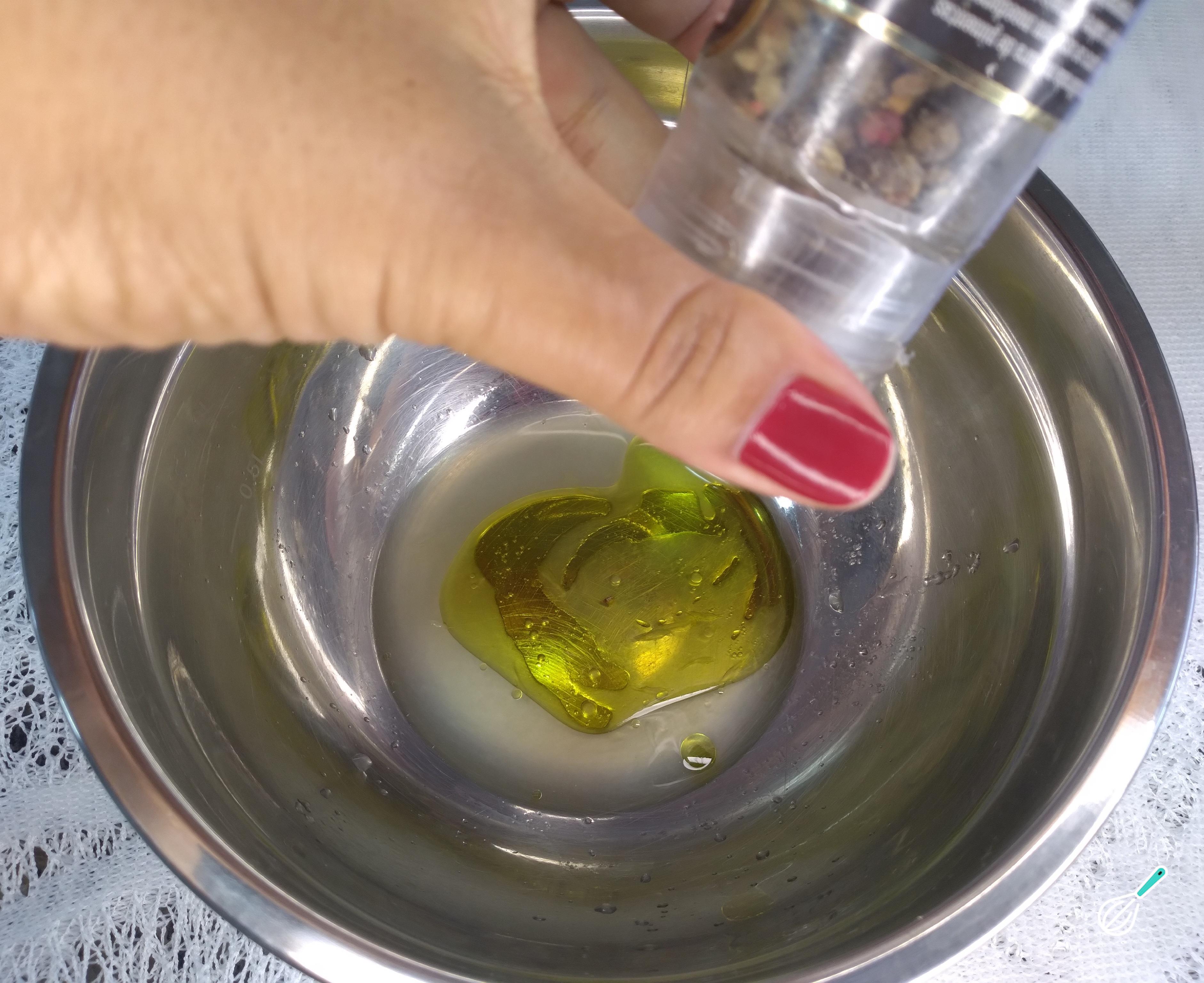 Feito isso, em um bowl coloque o vinagre, esprema o limão, azeite, o sal e a pimenta. Coloque também o alho em pó e o gengibre em pó. Mexa tudo muito bem. Esse molho será o tempero da vinagrete.