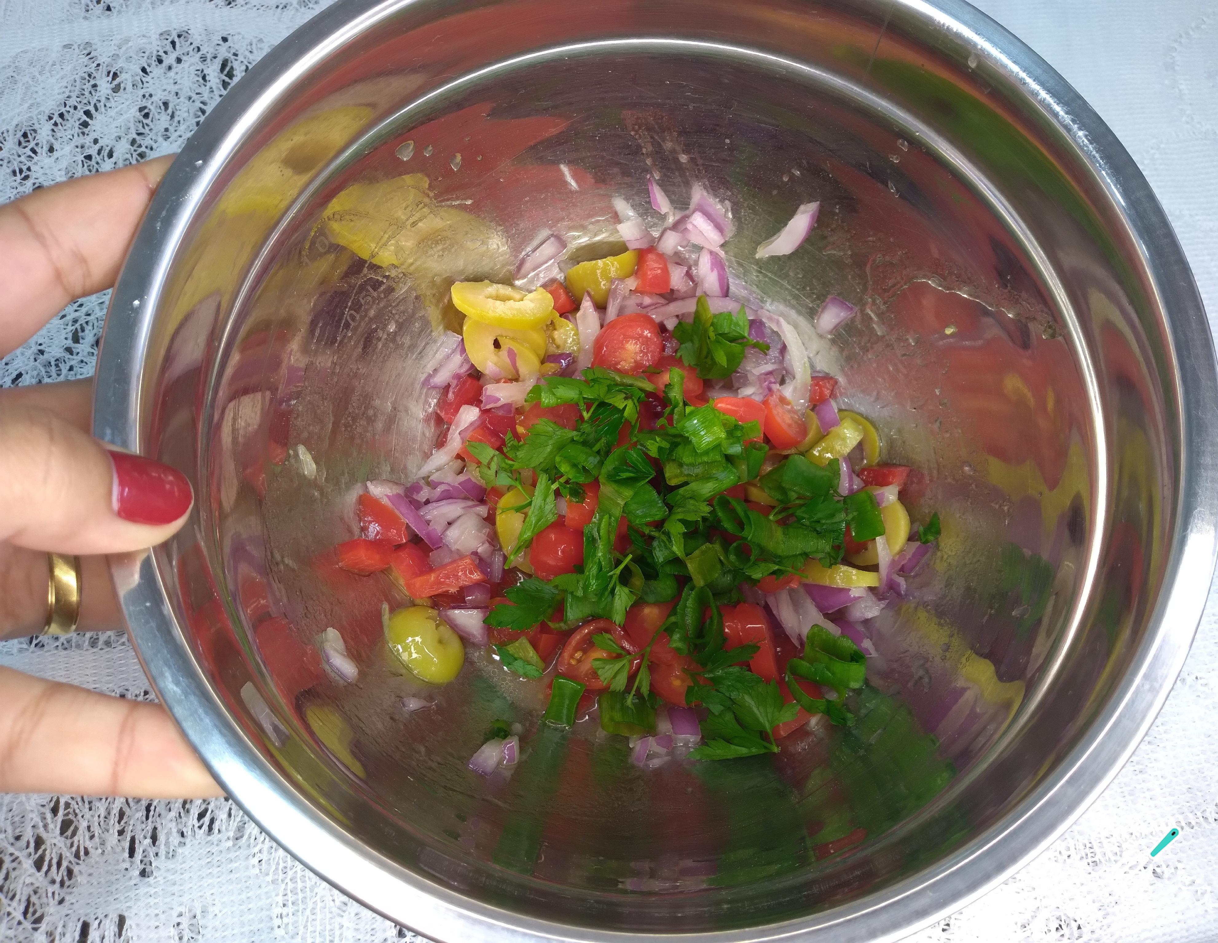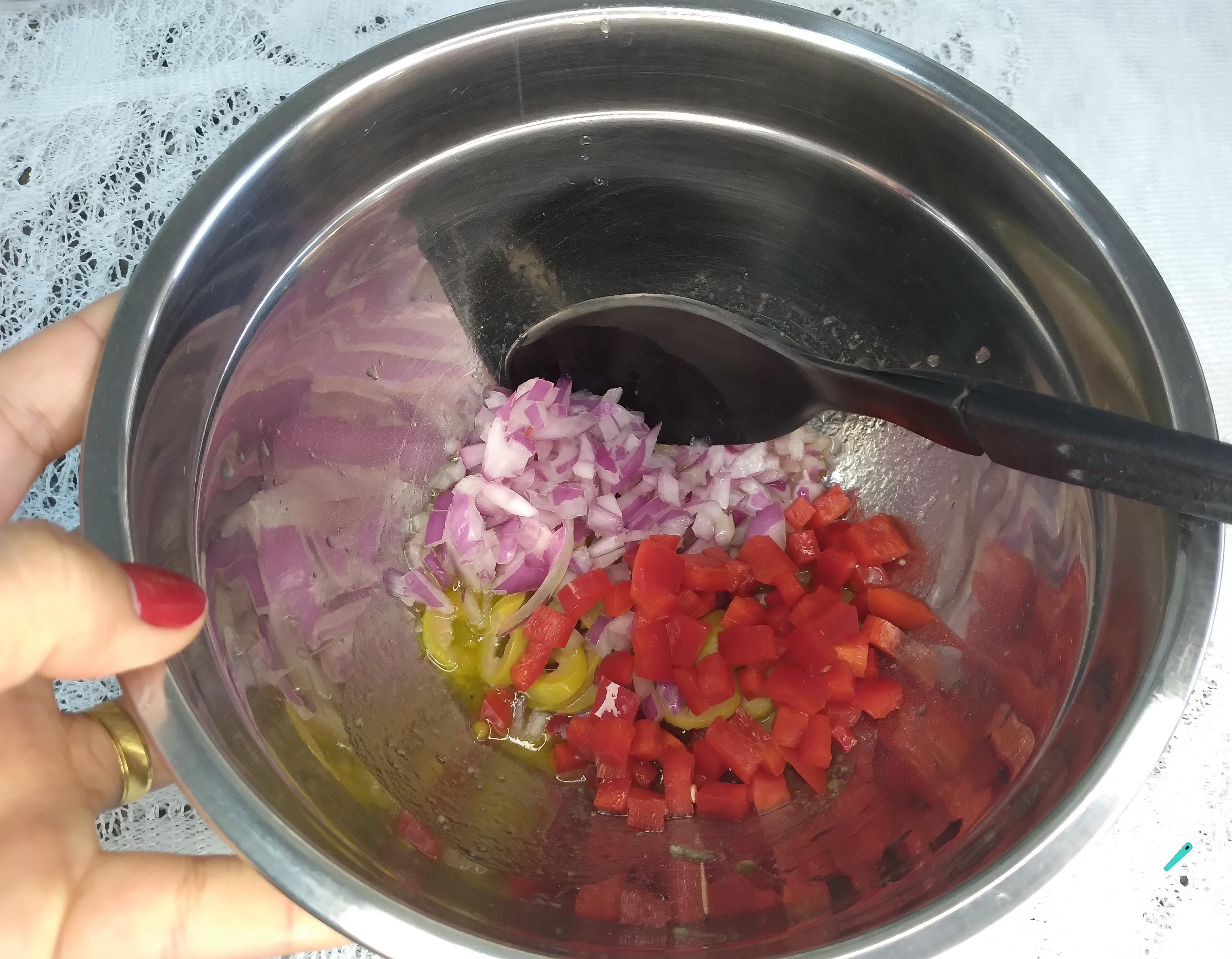 Feito isso, acrescente dentro do bowl, as azeitonas verdes, a cebola roxa picada e o pimentão picado. Misture tudo muito bem, porém delicadamente para não danificar os ingredientes. O ideal é que fiquem cortados igualmente para a estética do prato. Se tratando de um prato de comida fria, ficará mais bonito visualmente.