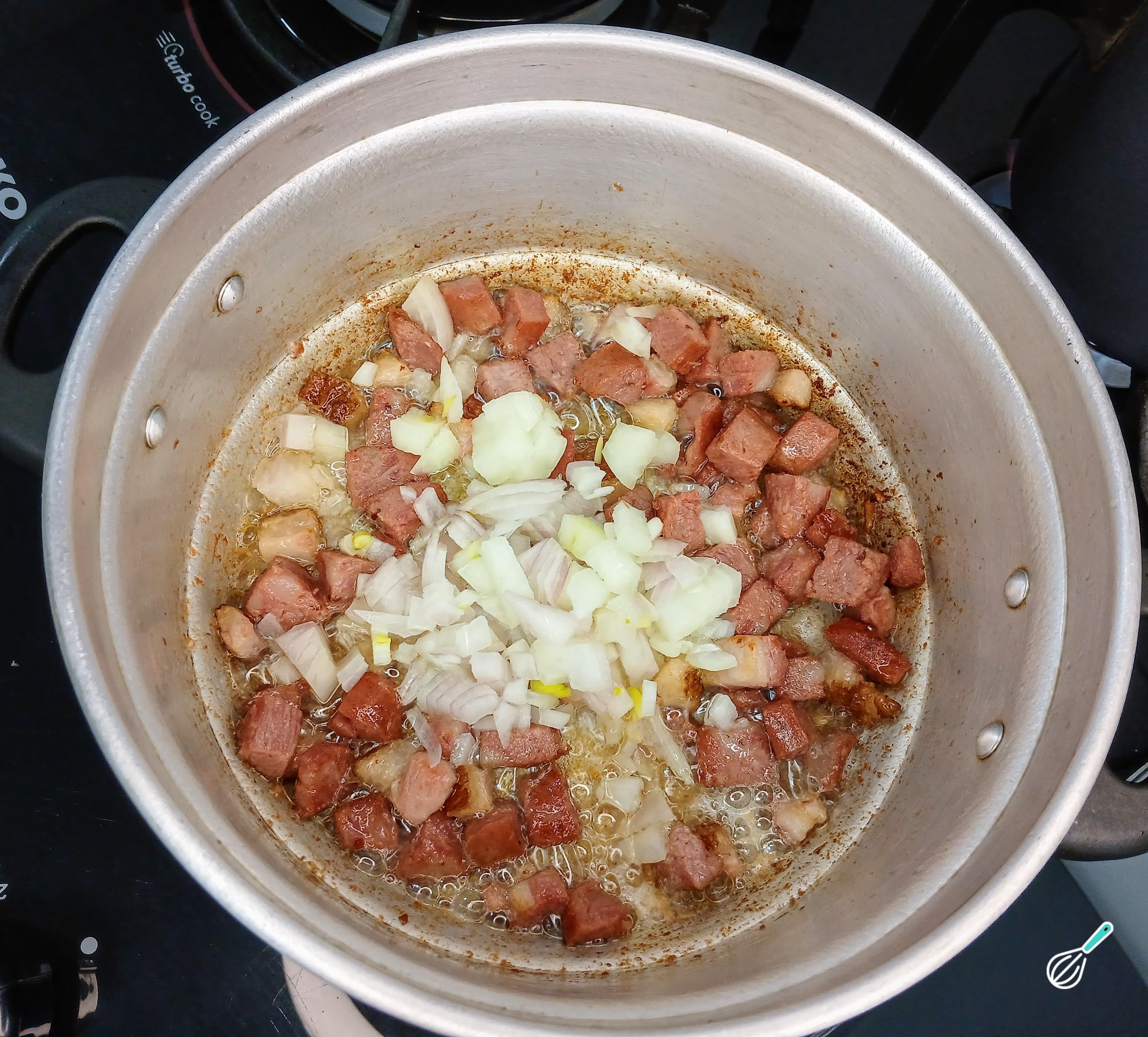 Depois disso, em uma panela coloque o óleo de soja, o bacon e a calabresa. Em fogo baixo, frite os dois e deixe-os dourar. Em seguida, coloque a cebola para fritar, mexa bem para não grudar ao fundo e depois de fritar bem o bacon, a calabresa e a cebola, acrescente os temperos e misture bem para que fique bem temperado.