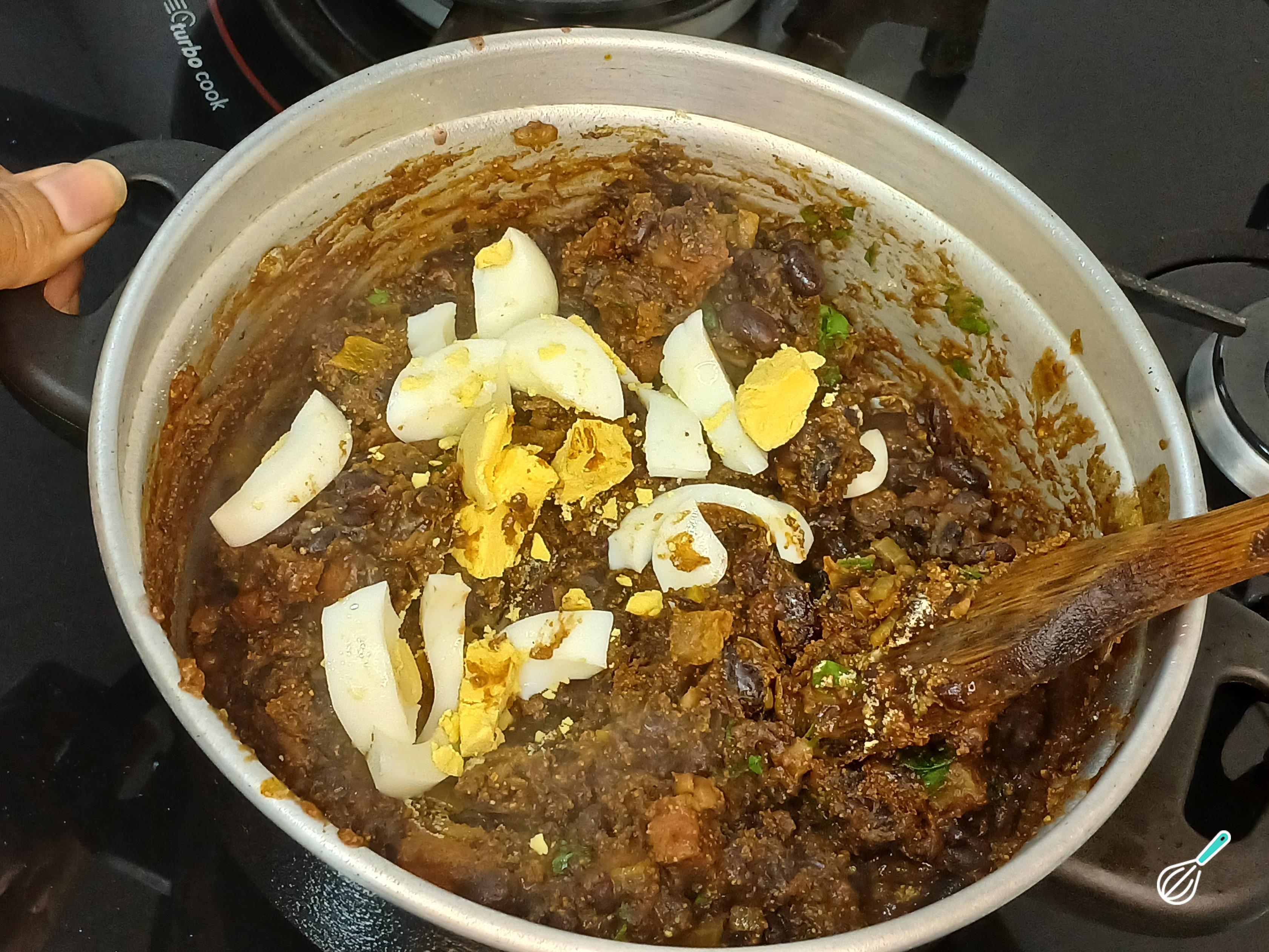 Por último, acrescente os ovos cortados (reserve os ovos cortados em rodelas). Experimente e acerte o sal e pimenta se necessário. Misture tudo muito bem.
